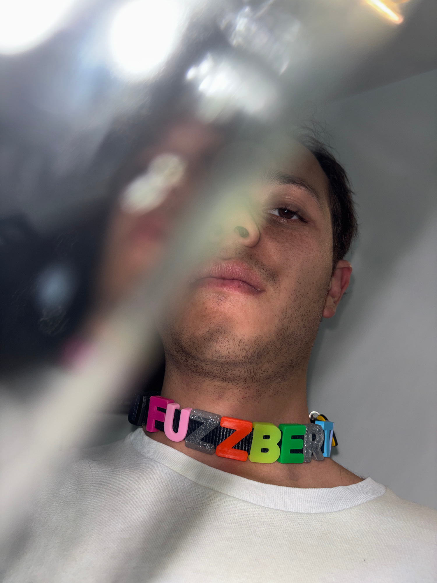 A medium shot of a man with brown hair and eyes, wearing a white t-shirt and a colorful necklace or bracelet that spells out "FUNZBE," is partially obscured by a blurry, light-filled foreground elemen…read more
