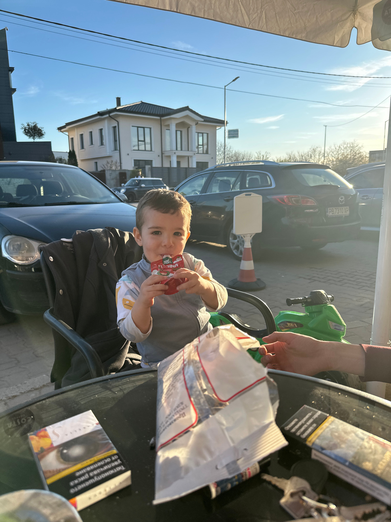 A young child is eating from a "Florina" brand food pouch, seated at a table outdoors, possibly at a cafe or a rest stop, in what appears to be the city of Plovdiv, Bulgaria. Several cars are parked n…read more