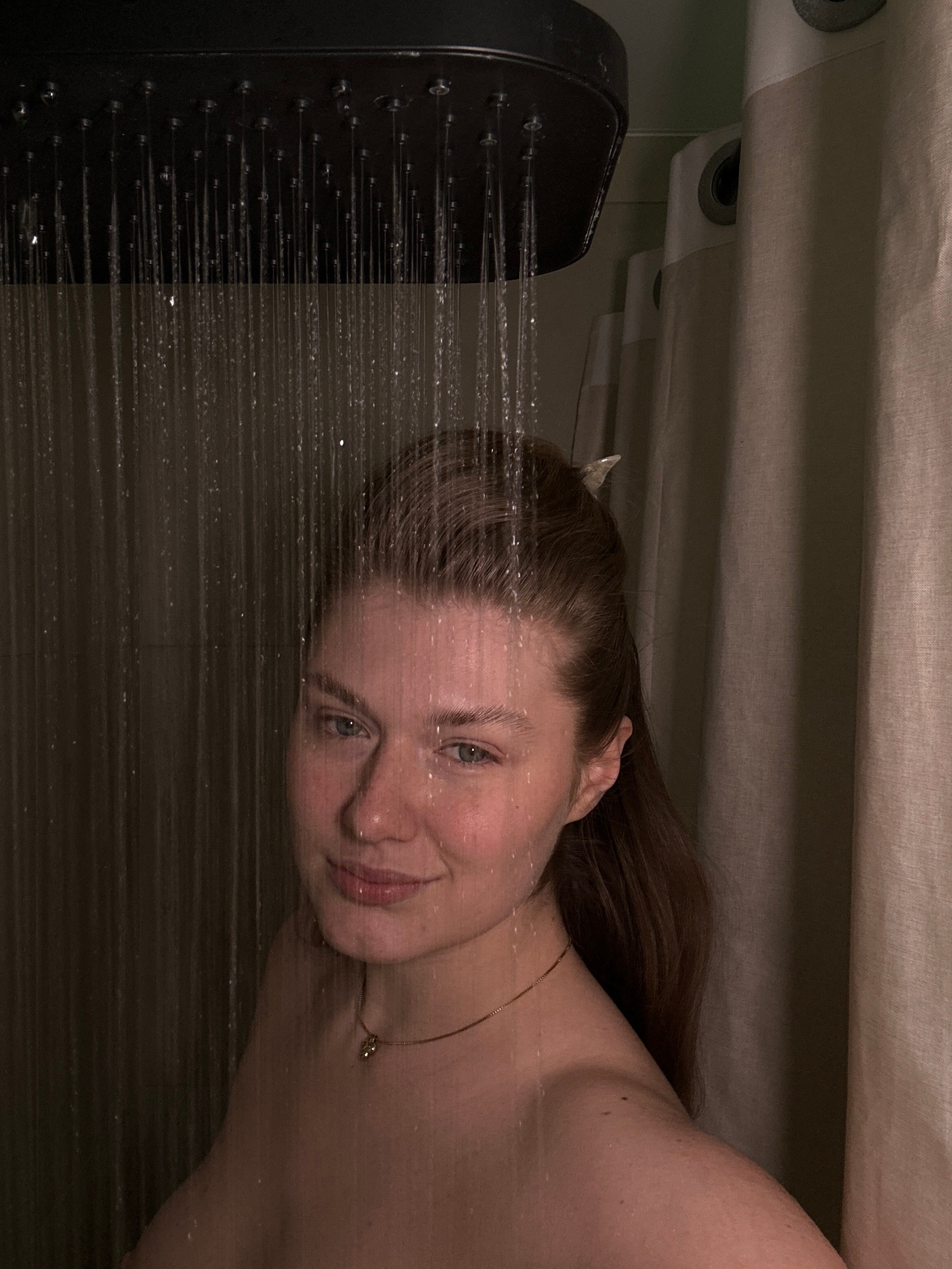 A woman is taking a shower. The showerhead is a large, square, black fixture with multiple small holes, spraying water. The woman's face and upper body are visible through the water spray. She has fai…read more