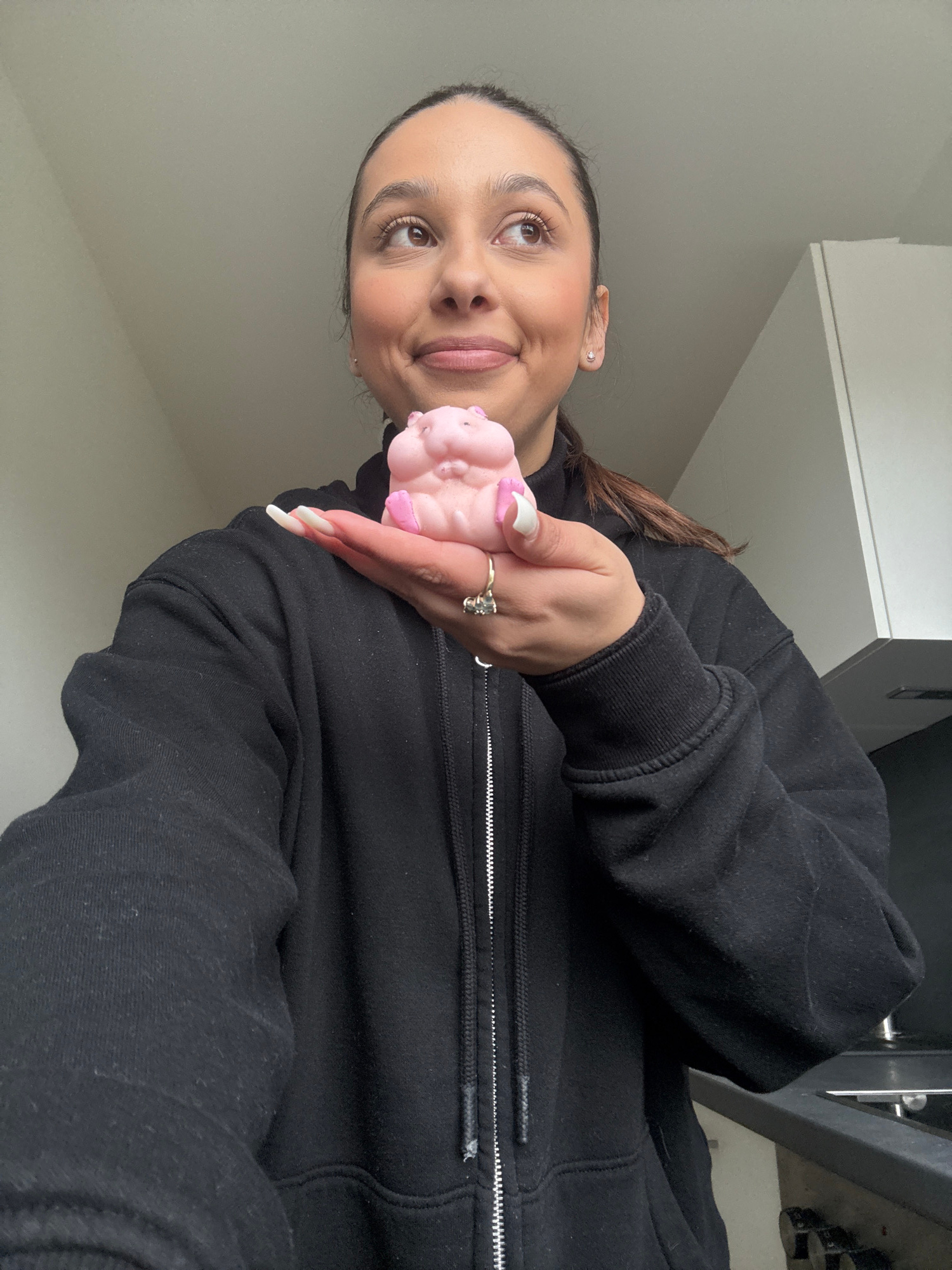 A woman with brown hair pulled back, wearing a black zip-up hoodie, is holding a small, pink, shaped object (possibly a toy or craft item) in her left hand. She is smiling slightly and looking upwards…read more