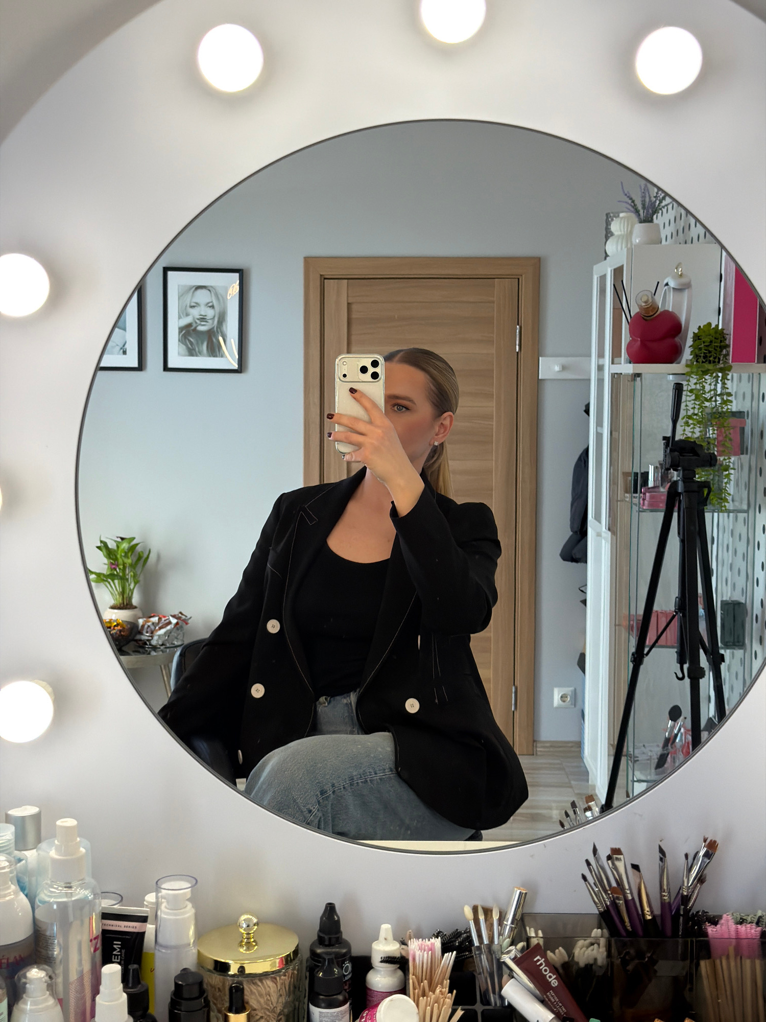 The image depicts a selfie taken in a mirror with built-in lights. A woman with blonde hair is holding a smartphone and facing the mirror. She is wearing a black blazer and denim jeans. Behind her, t…read more