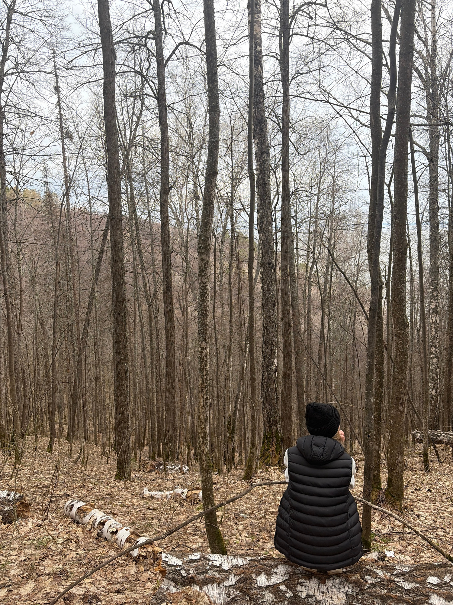A person wearing a black puffy jacket and a black hat stands in a forest in Novyi, Russia. The forest floor is covered in brown leaves and fallen branches. The trees are tall and bare, with only a few…read more