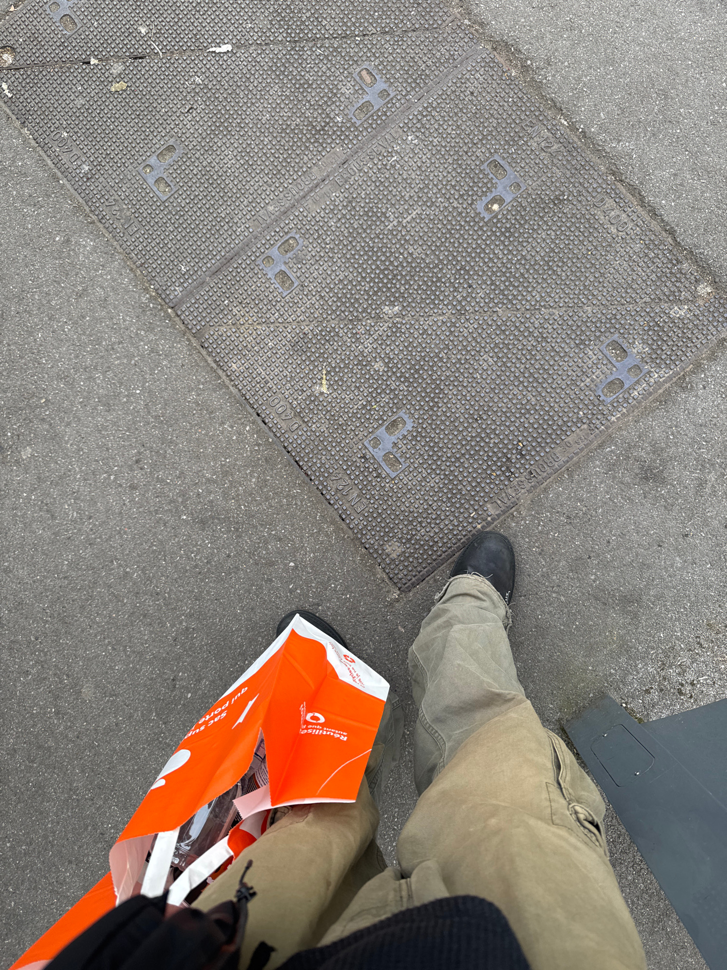 The image captures a street scene, focusing on a square utility access cover on a paved surface. The cover features a textured, dotted surface and multiple square indentations. In the upper right quad…read more