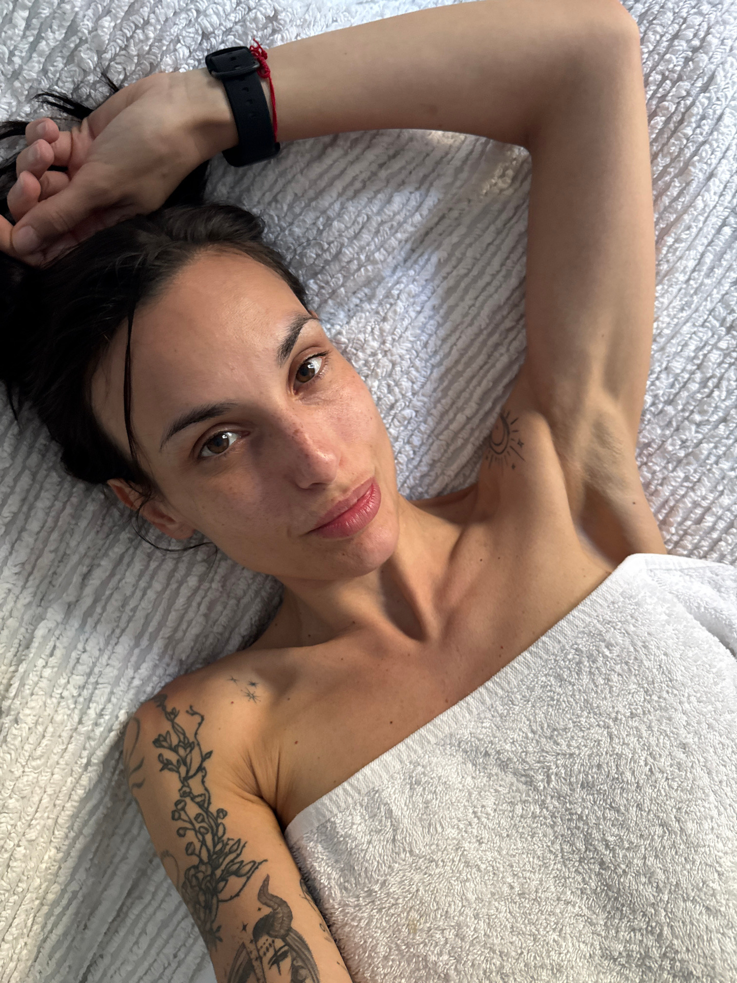 A woman is lying on a white textured surface, possibly a bed or a towel, indoors. Her head is slightly tilted towards the viewer. She has dark hair and brown eyes, and her skin appears to be fair with…read more