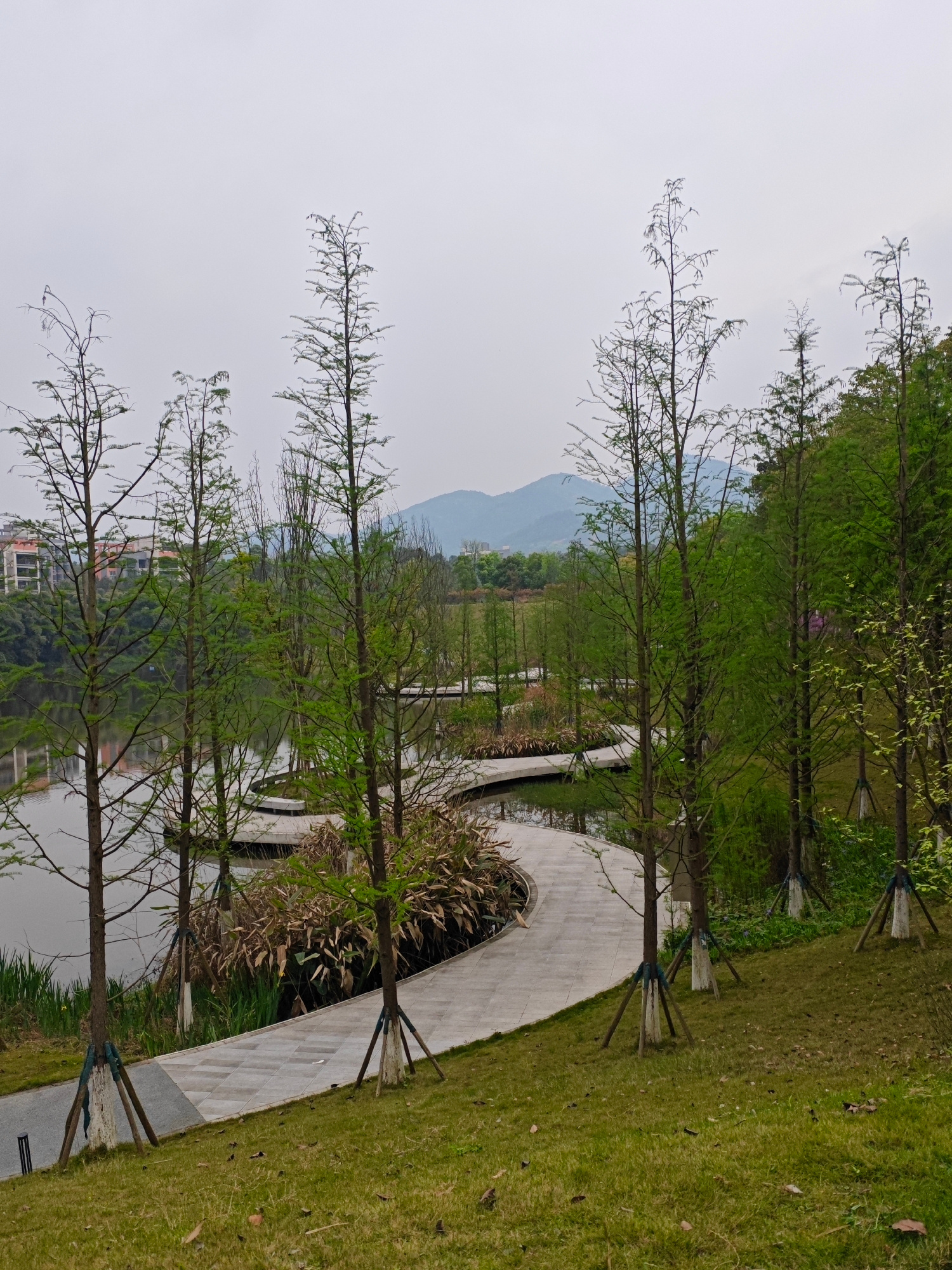 The image depicts a park landscape in Chongqing High-tech Zone, China. A winding, gray-tiled walkway extends through the scene, flanked by water on one side and grassy terrain interspersed with trees…read more