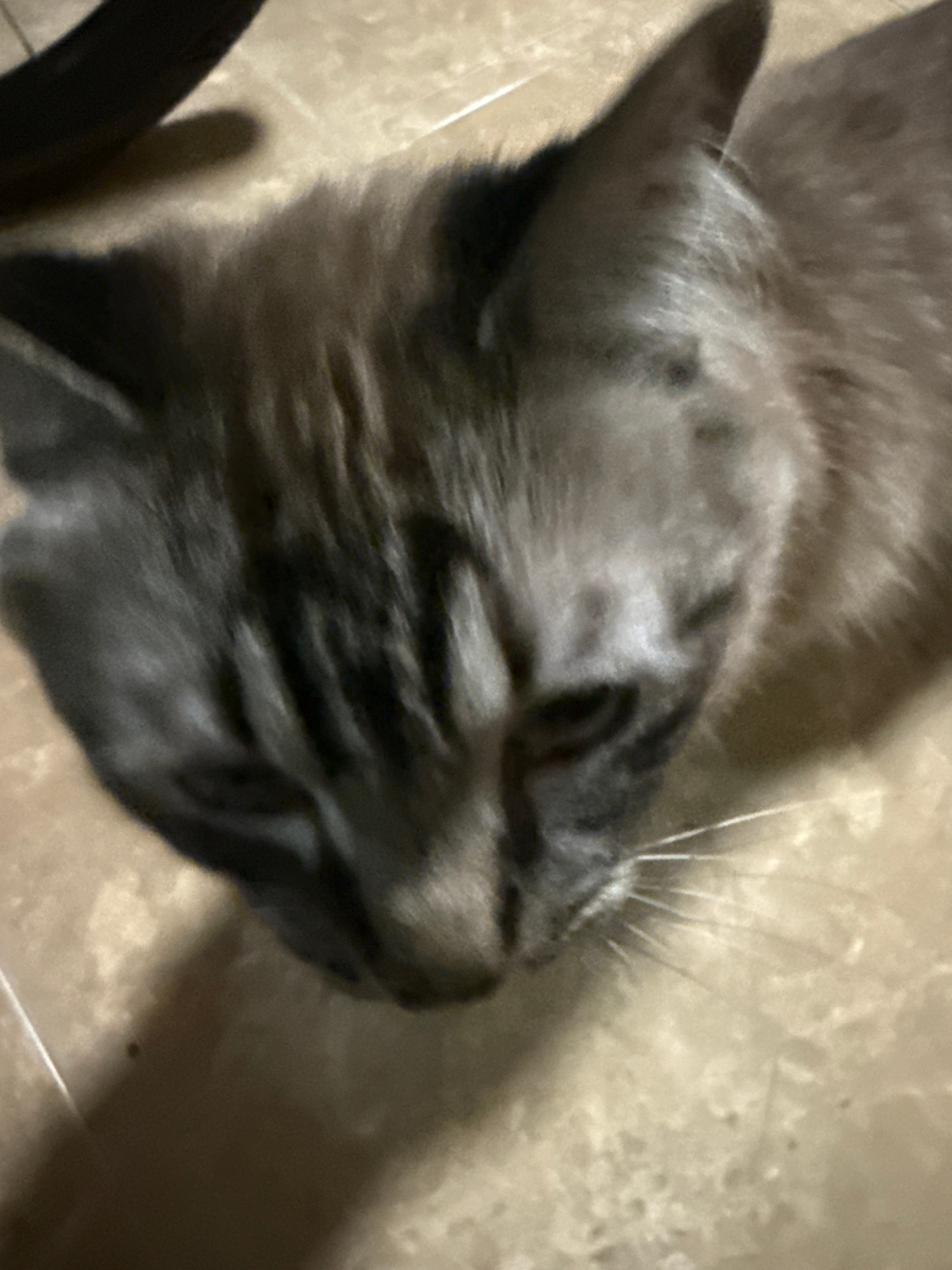 A close-up, slightly angled shot depicts a sleeping cat on what appears to be a tiled floor. The cat is primarily gray with dark brown markings. Its head occupies most of the frame, with its eyes clos…read more