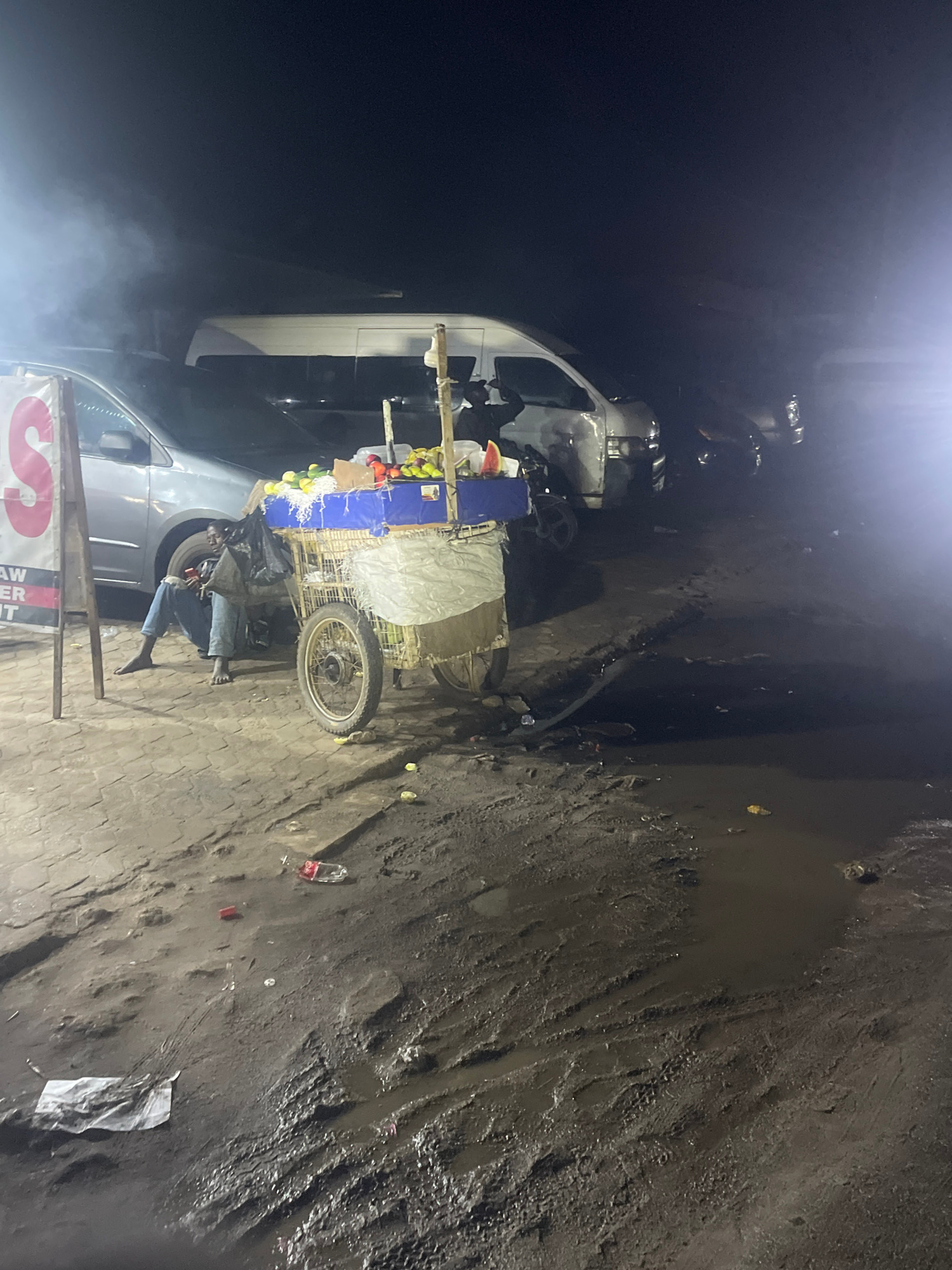 A street scene in Obiaruku, Nigeria at night. A man sits on a low seat beside a fruit cart filled with produce. The cart stands next to a light-colored van. The ground is uneven and muddy in places, s…read more