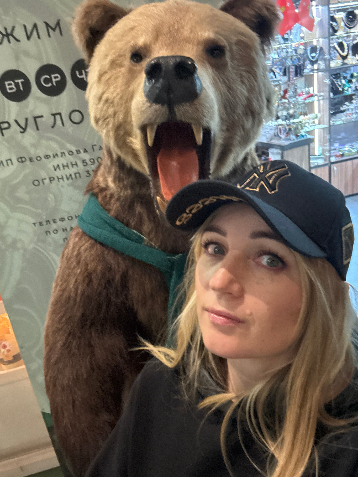 A blonde woman with a baseball cap takes a selfie with a stuffed bear head, inside a shop in Bolshoye Savino, Russia. The bear head has an open mouth and a green ribbon around its neck. The shop has j…read more