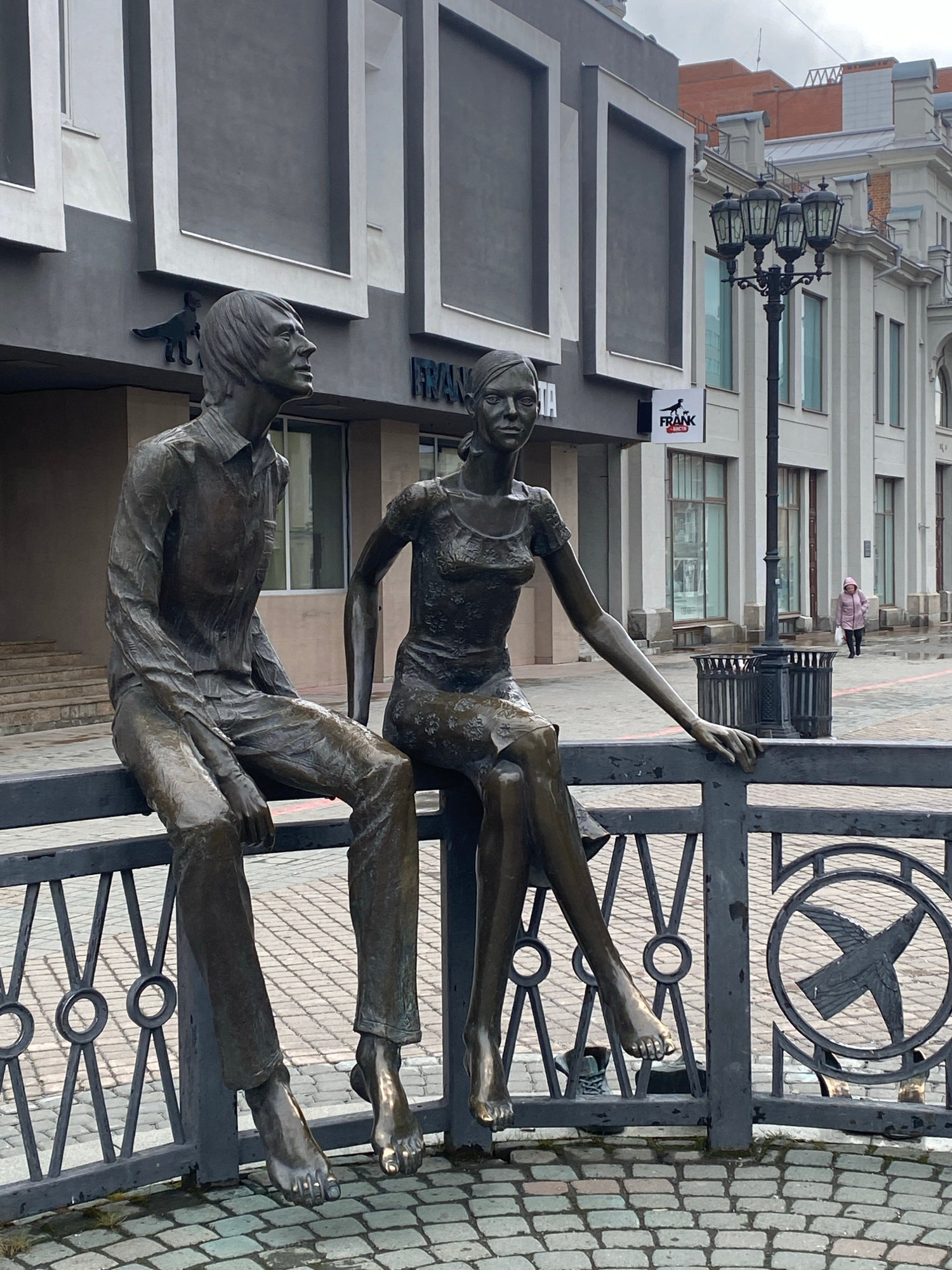 A bronze sculpture of a man and woman is attached to a black metal fence, which is set on a brick sidewalk. The man is lying down, propped up on his arm with his legs extended, and the woman is sittinβ¦read more