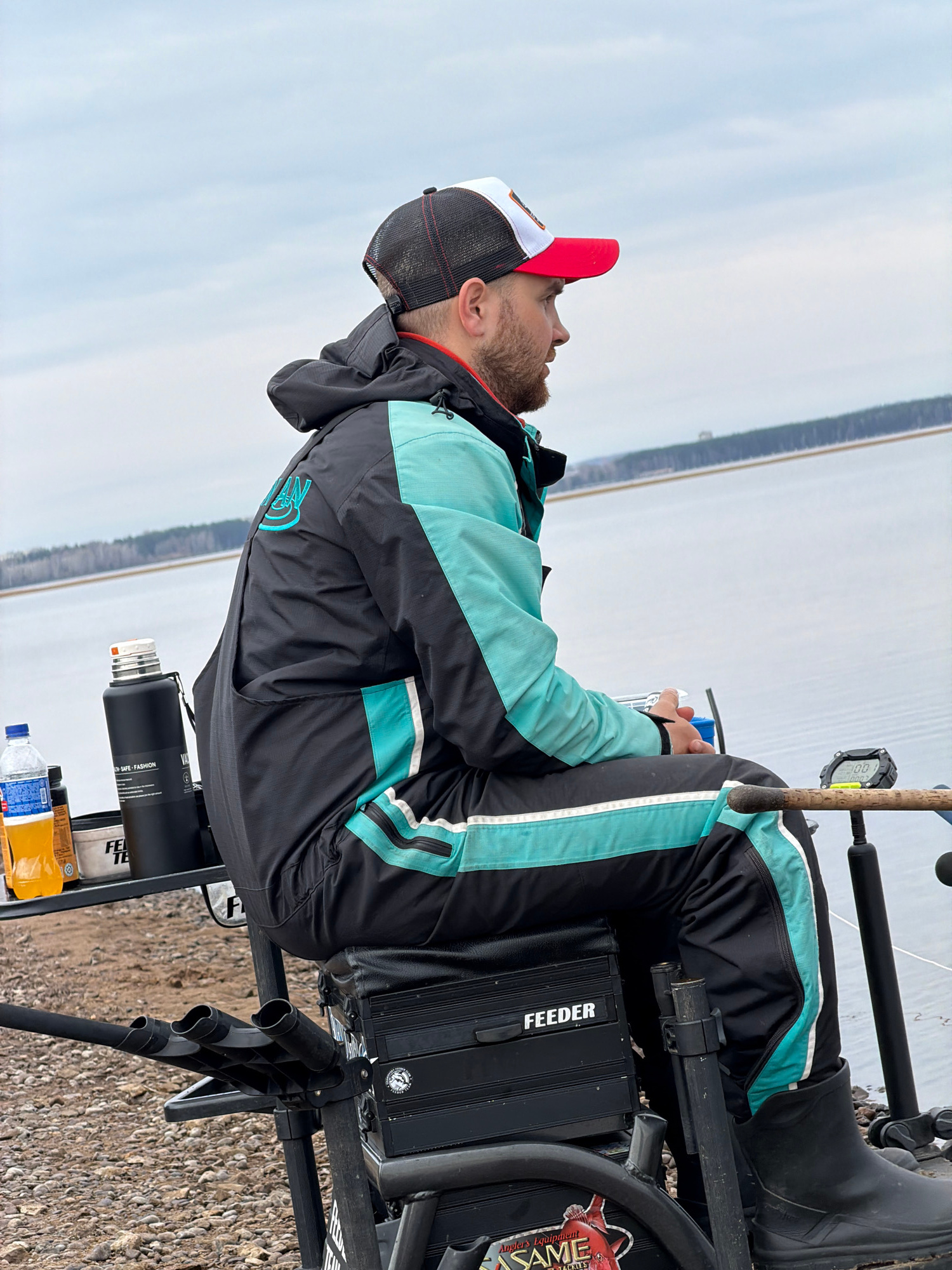 A man is seated on a fishing chair by a body of water, possibly the Kama River, in the city of Chaikovsky, Perm Krai, Russia. He is wearing a black and turquoise jacket, black pants with turquoise str…read more