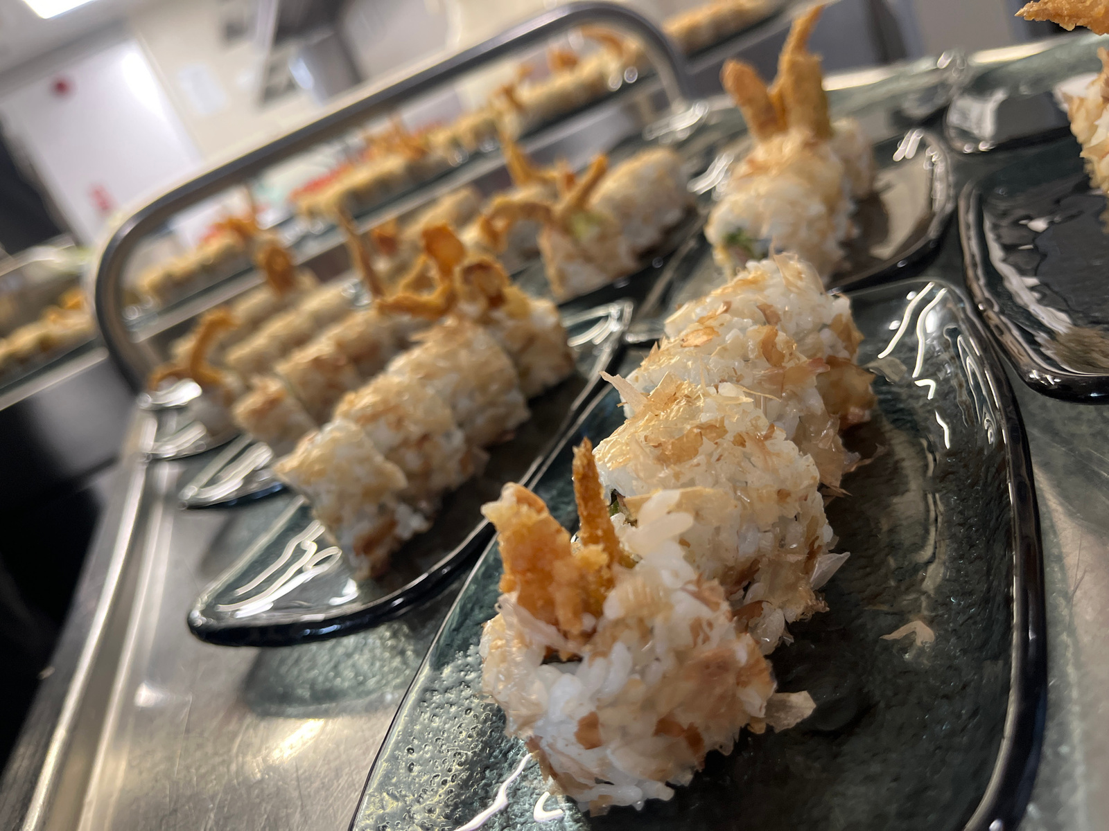The image presents an angled, close-up view of several rows of sushi rolls arranged on dark, textured rectangular plates. The sushi in the foreground is sharply focused, showcasing what appear to be Eā¦read more