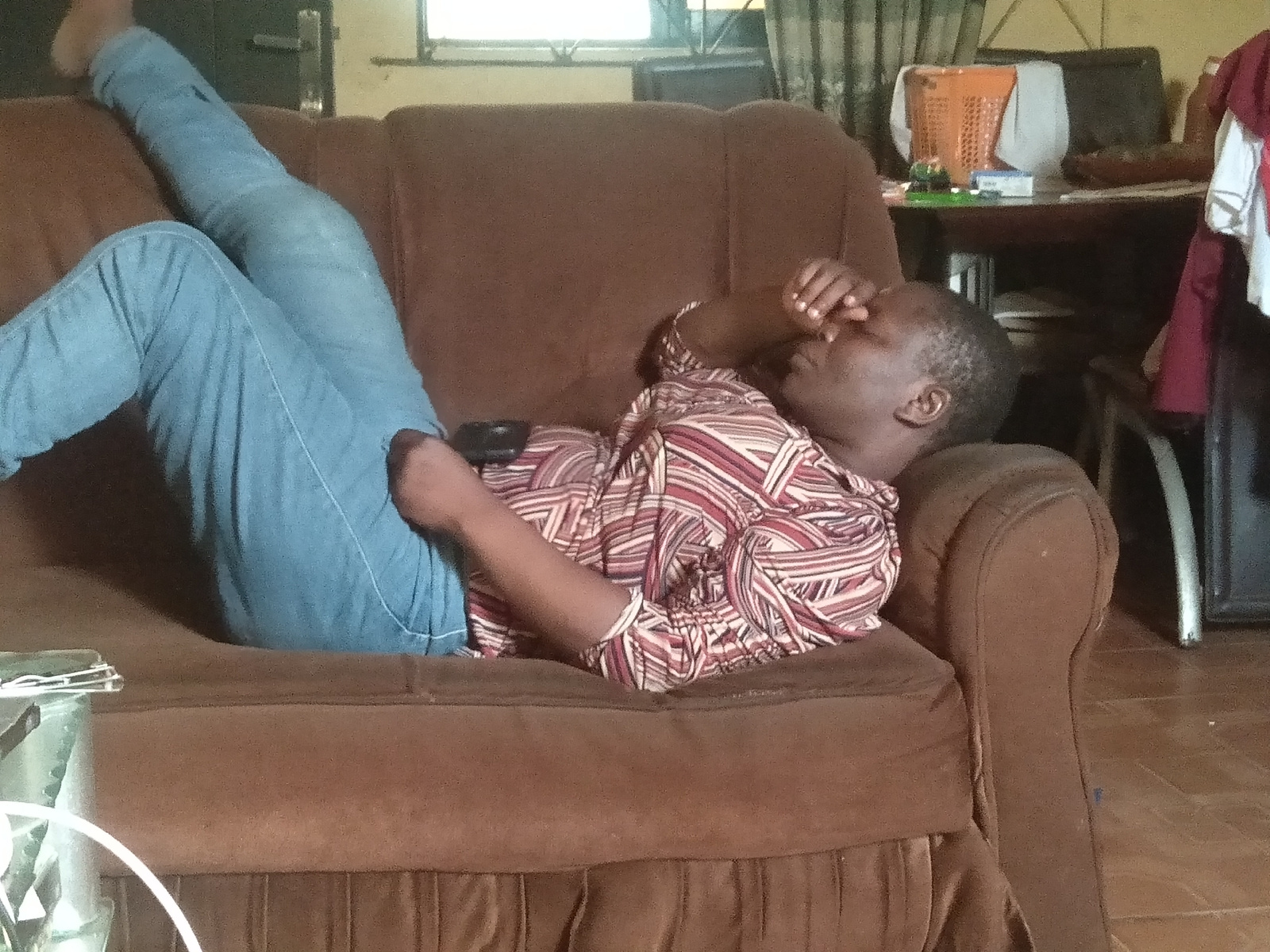 An indoor scene shows a person relaxing on a brown fabric sofa. The individual, appearing to be an adult, is lying on their back with their legs bent and raised, clad in light blue jeans. They are wea…read more