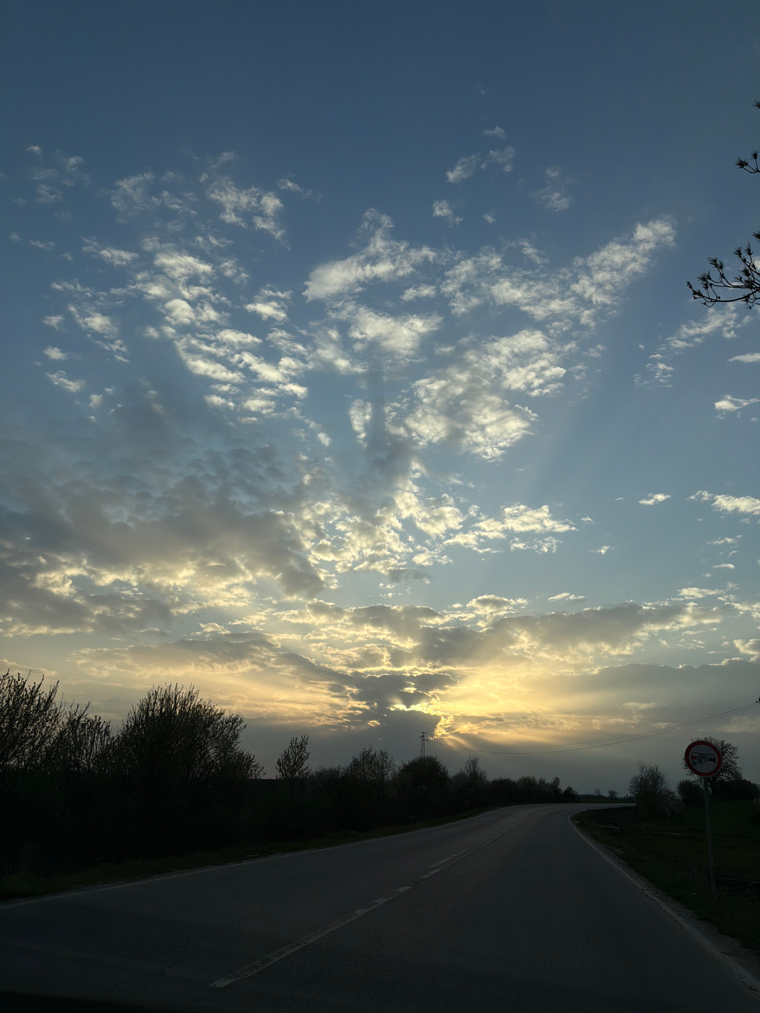 A landscape photograph depicts a rural asphalt road stretching into the distance on the right side, bordered by trees on the left and a partly cloudy sky illuminated by the setting sun. A road sign wi…read more