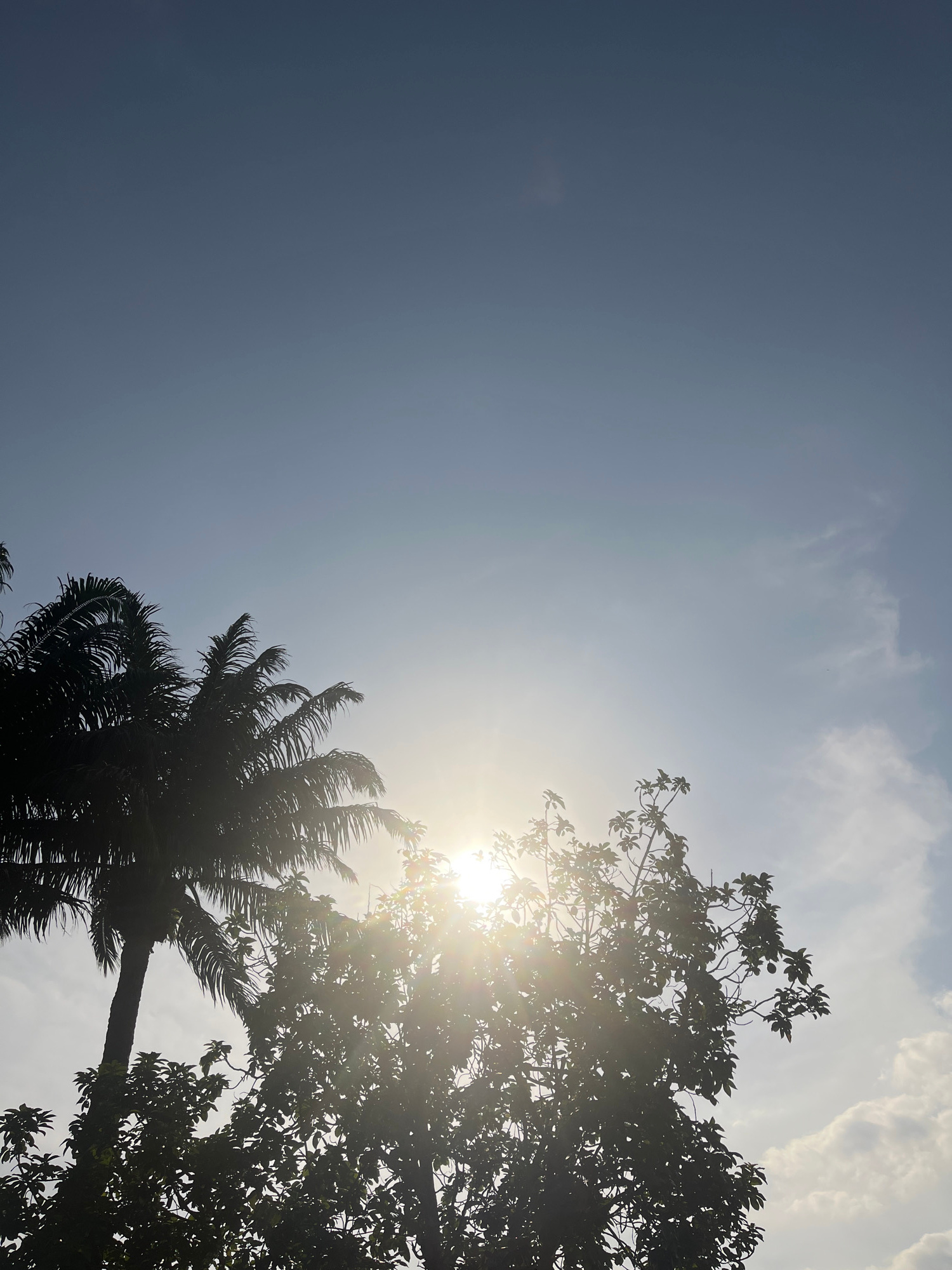 The image presents an upward perspective of a bright sky dominated by a strong, central sunburst. Two trees are silhouetted prominently against the intense light. On the lower right, a palm tree featu…read more