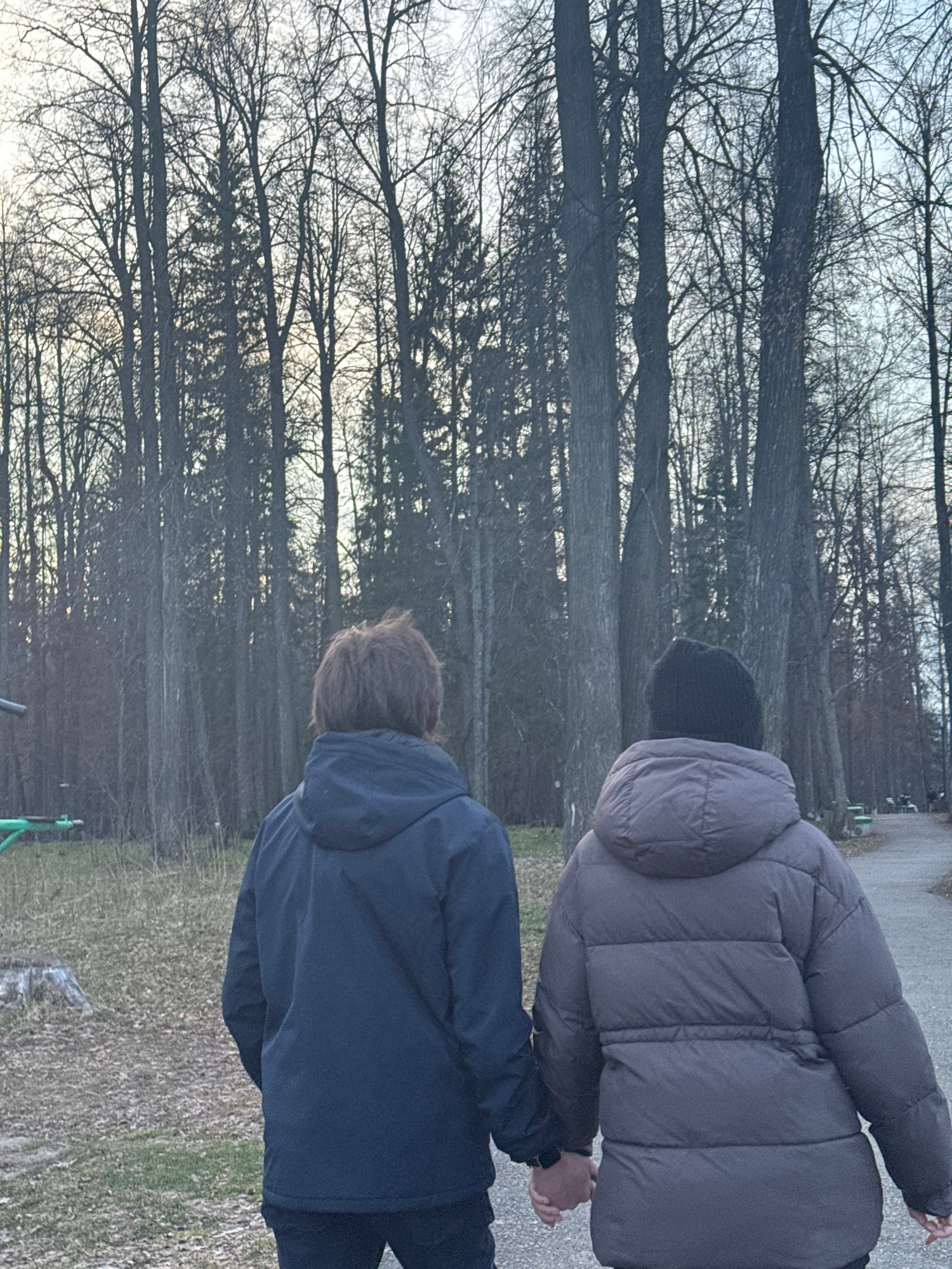Two individuals are walking on a paved path. One is wearing a gray puffy jacket and a black beanie. The other is wearing a navy blue jacket and has short brown hair. The location is Chernushka, Russia…read more