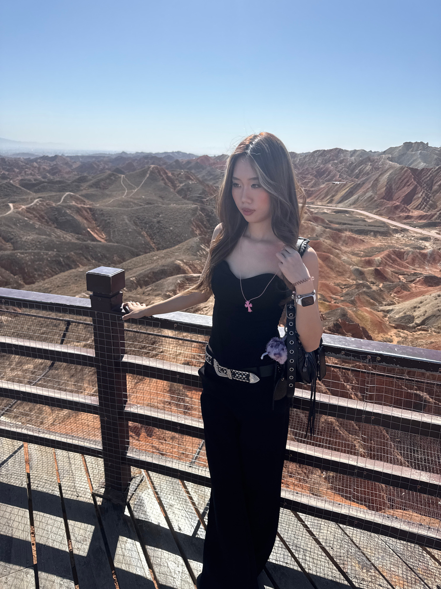 A young woman stands on an elevated outdoor walkway, posing with a vast, colorful mountain landscape in the background, under a clear, bright sky. The image is taken in direct daylight, indicated by t…read more