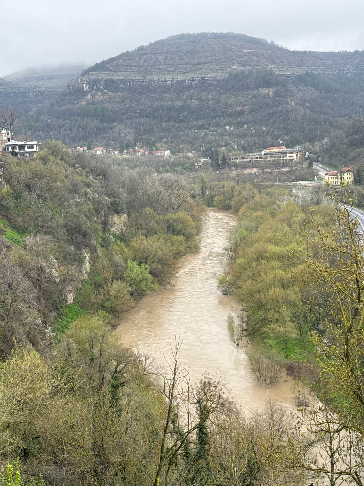 The image presents a view overlooking the Yantra River in Veliko Tarnovo, Bulgaria, with a perspective that captures the river's winding path through the city's landscape. The Yantra River appears full and murky, suggesting a recent period of increased rainfall or snowmelt. Dense vegetation lines the banks of the river, with trees in varying states of foliage, some still bare while others display early signs of budding leaves. On the left side of the frame, a steep, mountainous slope rises, covered with trees and vegetation. Buildings and structures are visible along the riverbank and further up the slope, indicating urban development. The sky is overcast, contributing to a muted, subdued atmosphere. The presence of a bridge or road structure is partially visible in the upper part of the frame. | Open Wire