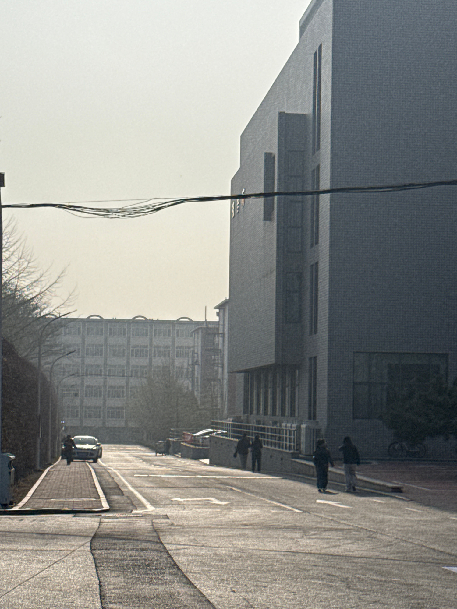 The image depicts a street scene, likely in an urban area. Two modern buildings are visible, with the larger one displaying a grid-like façade. Several pedestrians are walking along the sidewalk besid…read more