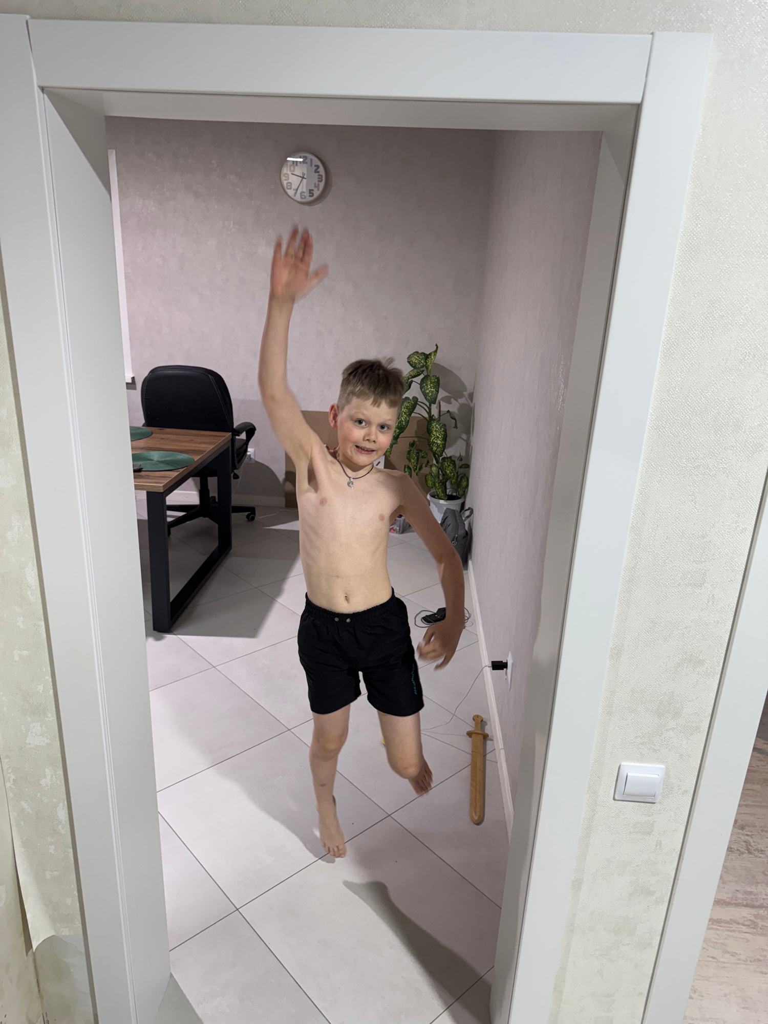 A shirtless boy is lying on the tiled floor of a room, framed by a doorway. He is wearing black shorts and a necklace. His left arm is outstretched towards a wall with a clock on it. A desk with a bla…read more