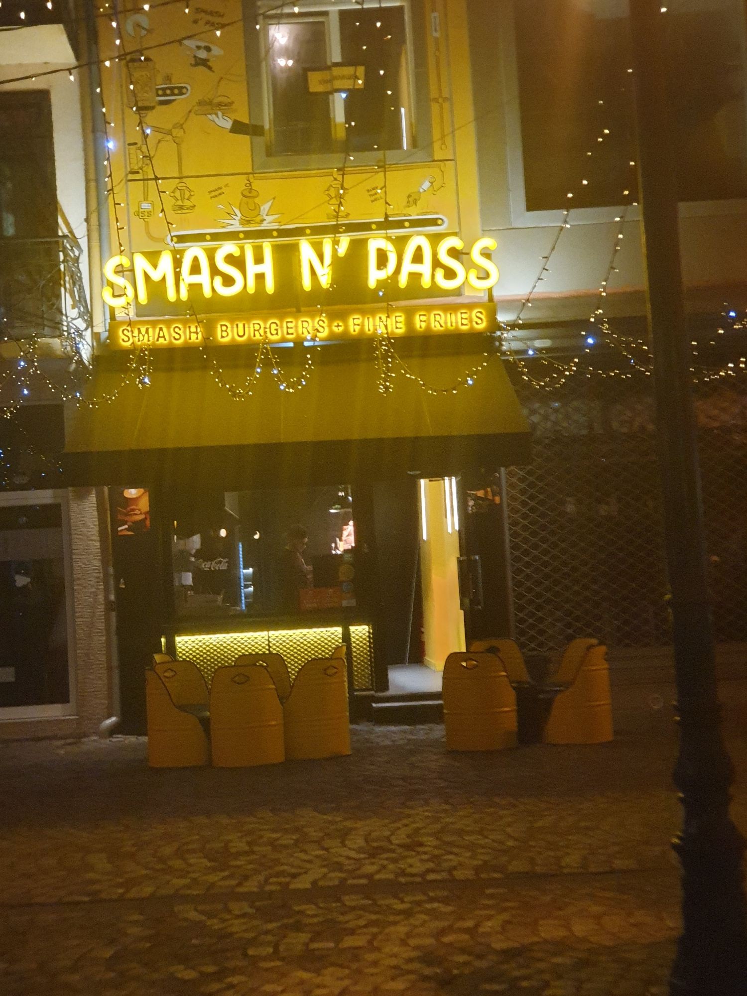 The image shows the exterior of "Smash N' Pass," a restaurant serving smash burgers and fine fries, located in Plovdiv, Bulgaria. The restaurant's bright yellow signage and decorations with strings ofโฆread more