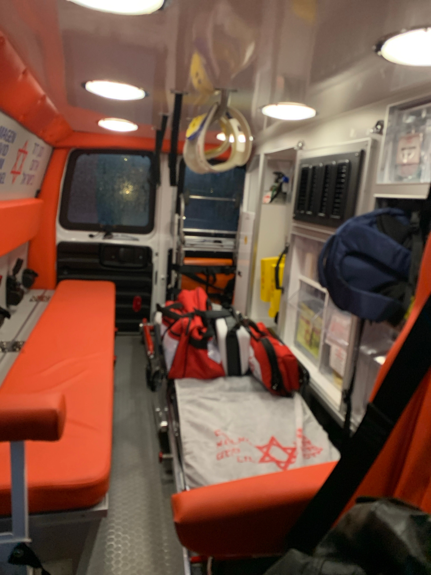 The image shows the interior of an ambulance. The walls and ceiling are white with built-in oval lights. Orange padding lines the lower walls and seating areas. There is a window on the left side of t…read more