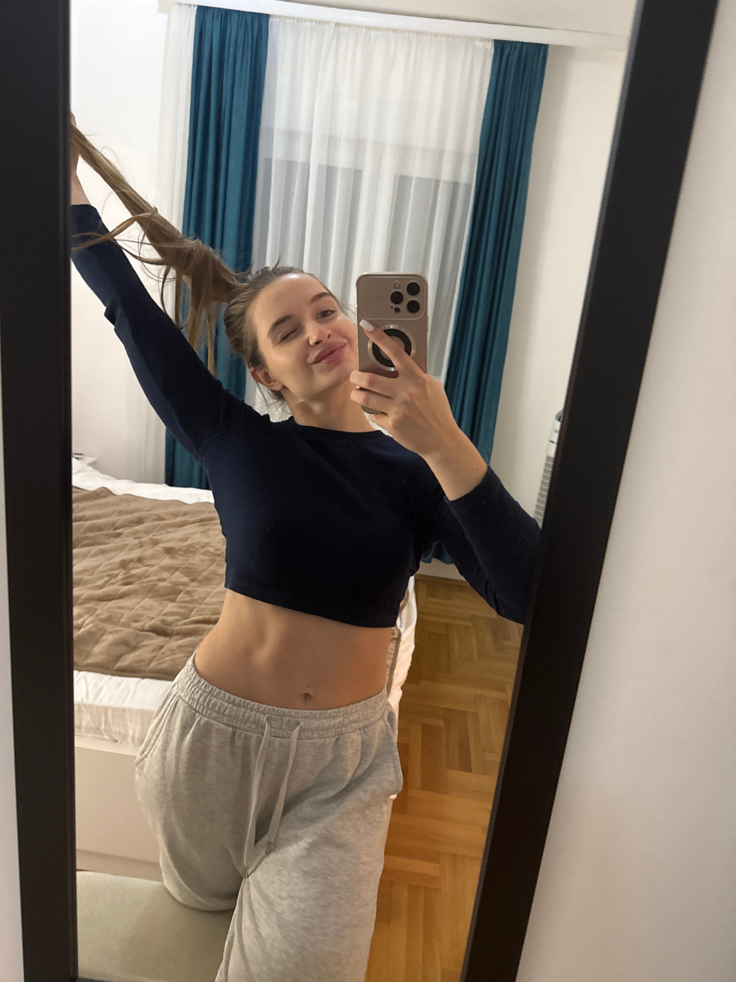 A young woman is reflected in a mirror, taking a selfie with a phone. She has light brown hair pulled into a ponytail and is wearing a dark blue long-sleeved crop top and light gray sweatpants. The ba…read more