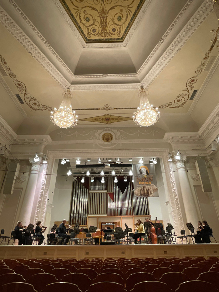 The image displays the interior of the Sverdlovsk State Academic Philharmonic Hall in Yekaterinburg, Russia, viewed from an audience perspective facing the stage. The hall features an ornate, light-co…read more
