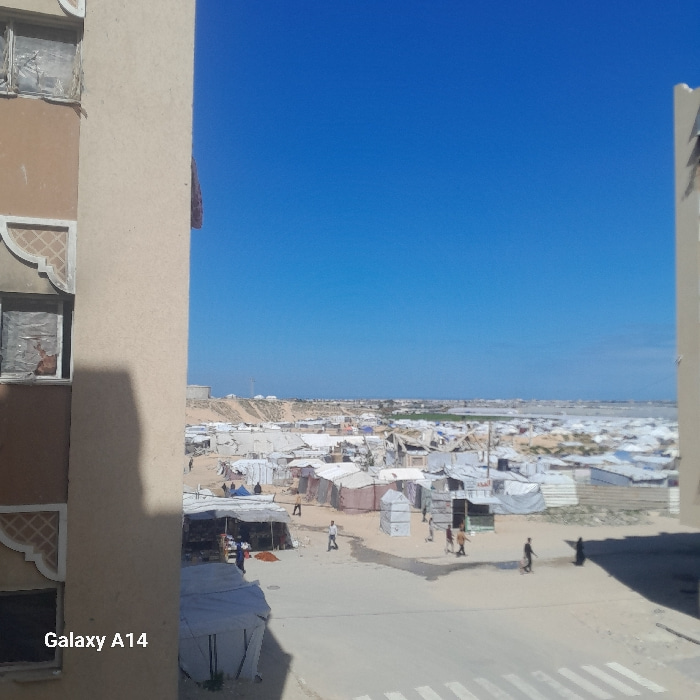 An elevated, wide-angle image depicts a densely populated temporary settlement or refugee camp in Khan Yunis, Palestinian Territory, under a clear, bright blue sky. On the left, a portion of a multi-…read more
