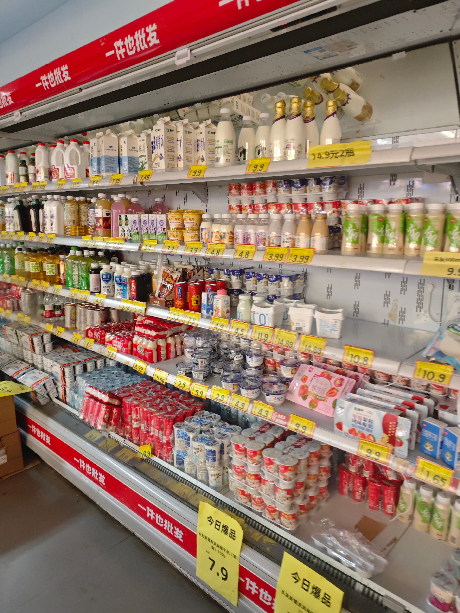 The image shows a refrigerated display case in a retail setting, likely a supermarket or convenience store. The shelves are stocked with a variety of dairy products, including milk, yogurt, and flavor…read more