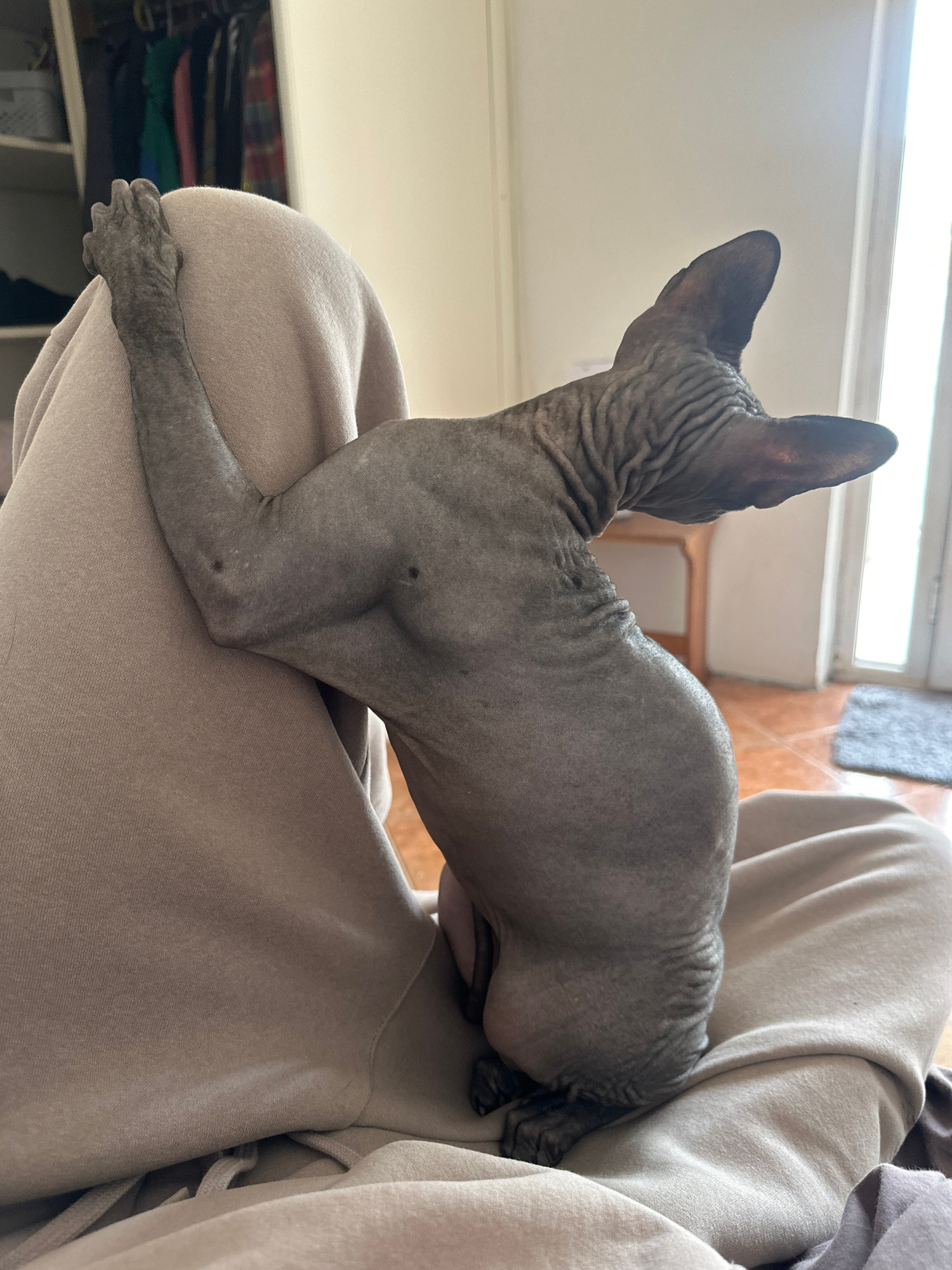 A hairless Sphynx cat with gray skin is resting on someone's lap, likely indoors, with a window and furniture visible in the background. The person is wearing light-colored sweatpants. The cat is faci…read more