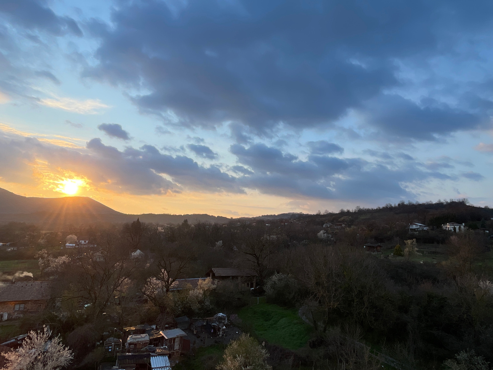 The image shows a view of Dryanovo, Bulgaria at sunset. The sun is partially obscured by a hill, casting rays across the sky. Below, a rural landscape is visible, including houses, trees, and vegetati…read more