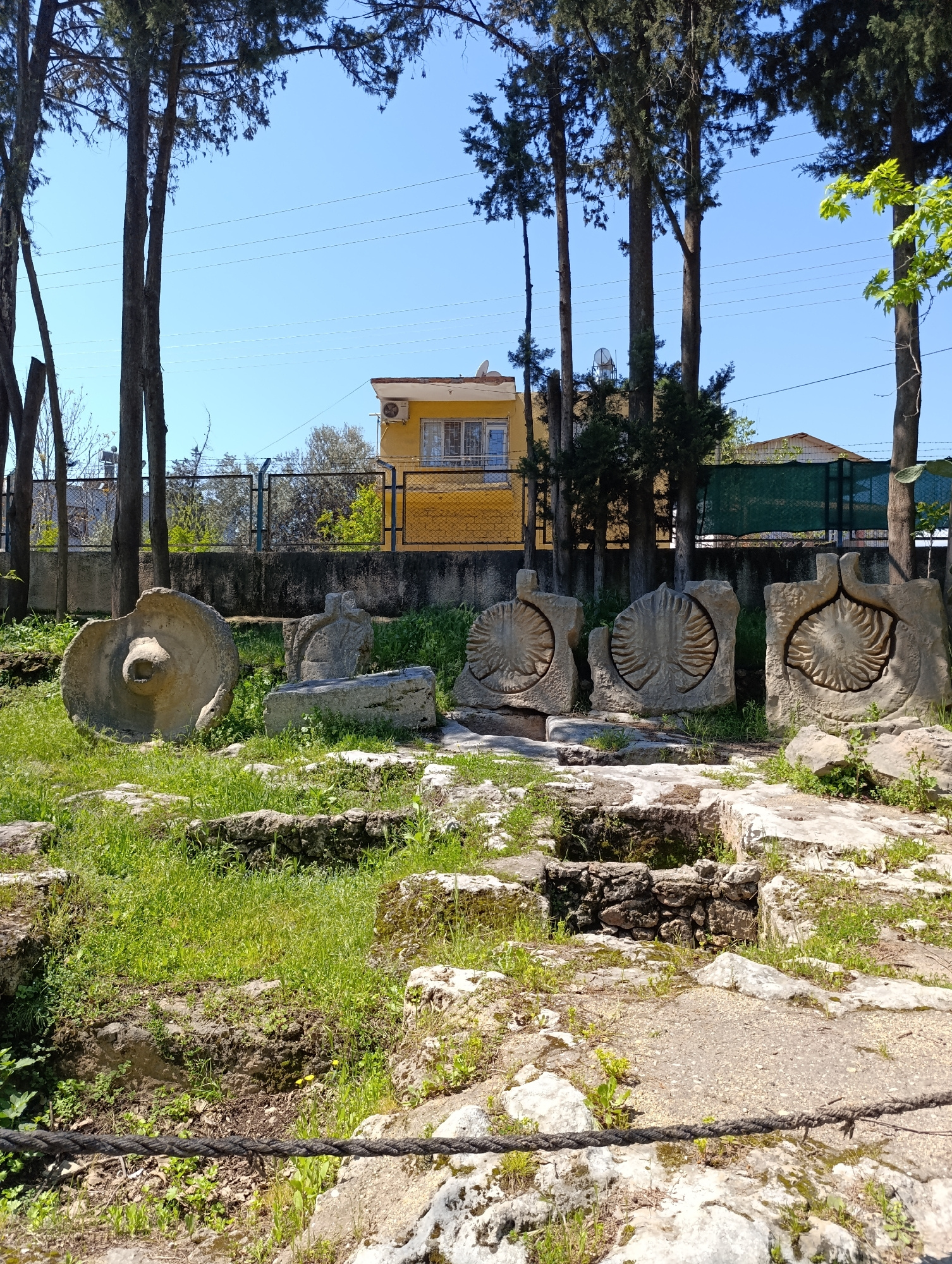 The image depicts an archaeological site in Kepez, Turkey, showcasing a collection of stone artifacts and architectural remnants. The artifacts consist of a large, round stone object with a central ho…read more