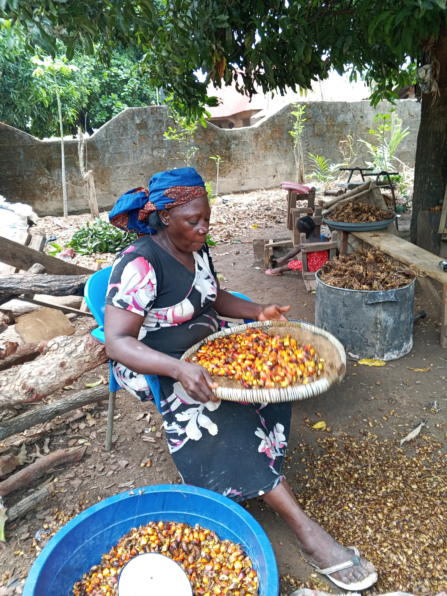 An elderly woman wearing a blue headscarf and floral print dress sits on a blue plastic chair in an outdoor area, possibly in the city of Unknown, Unknown. She is holding a woven tray filled with oran…read more