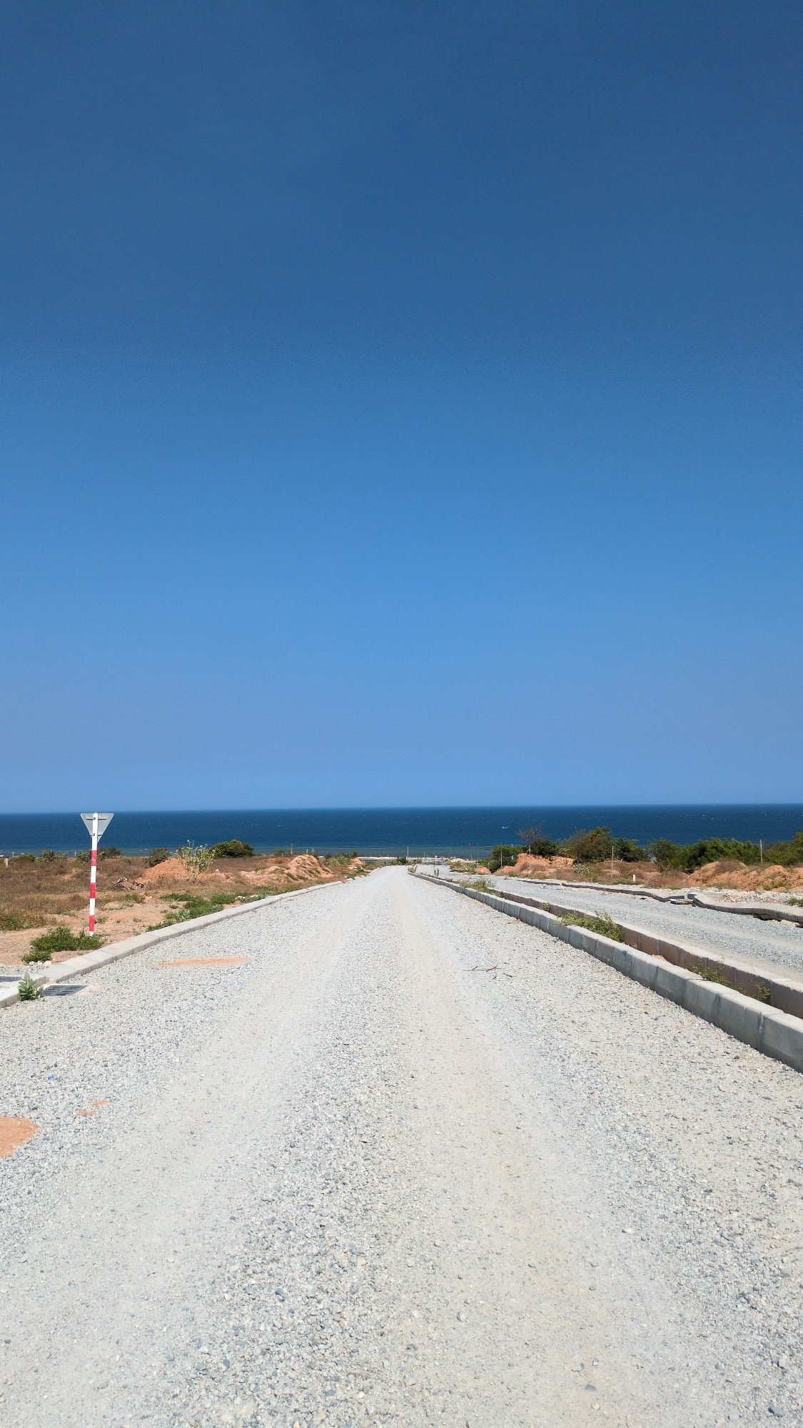 The image depicts a road in Phuoc Dinh, Vietnam. The road surface is gravel, and it runs parallel to the coastline. The sea is visible on the left side of the road, meeting the clear blue sky at the h…read more