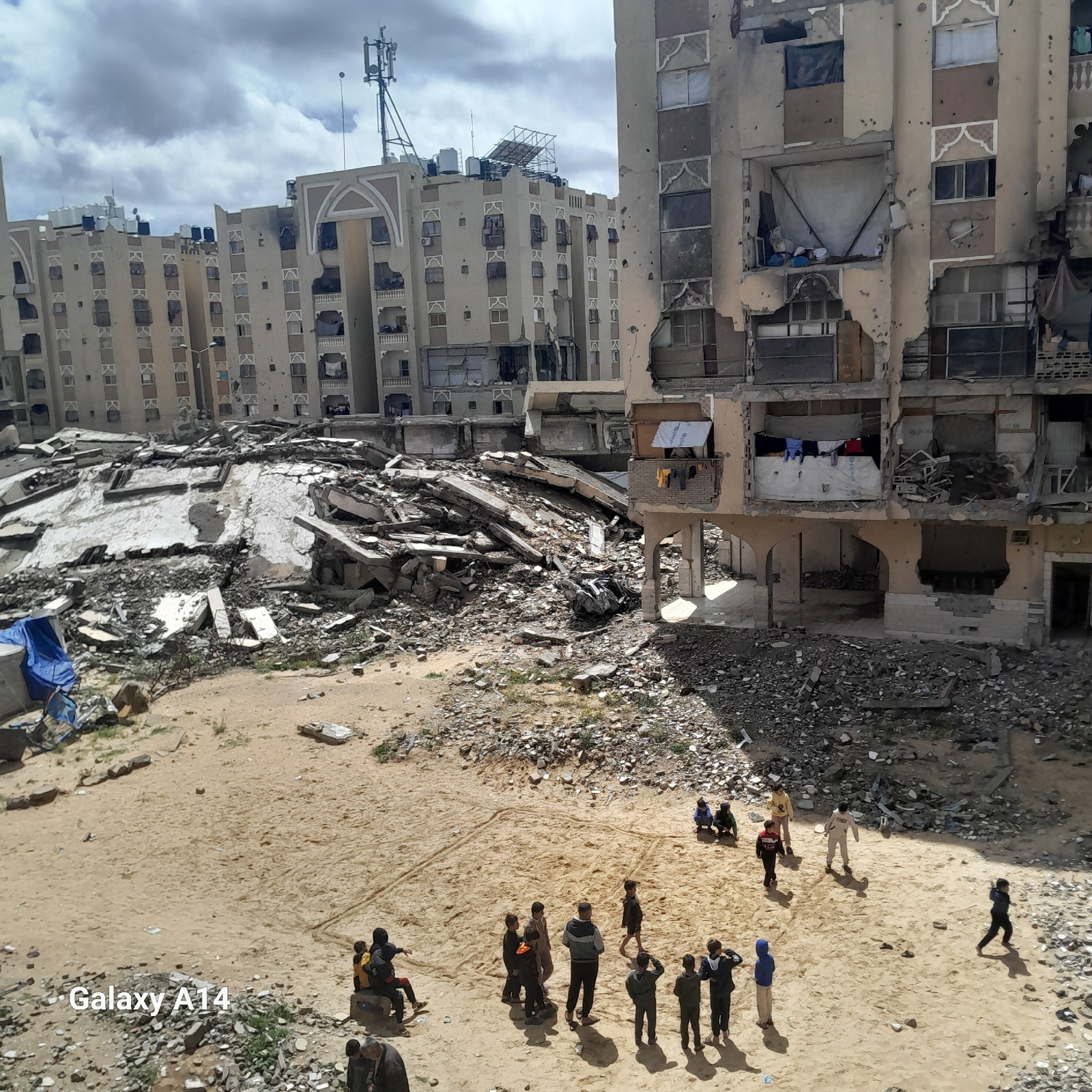 The image captures a scene of extensive urban destruction in Khan Yunis, Palestinian Territory, under a partially cloudy sky. In the foreground, approximately 15-20 children, predominantly boys, are pā¦read more