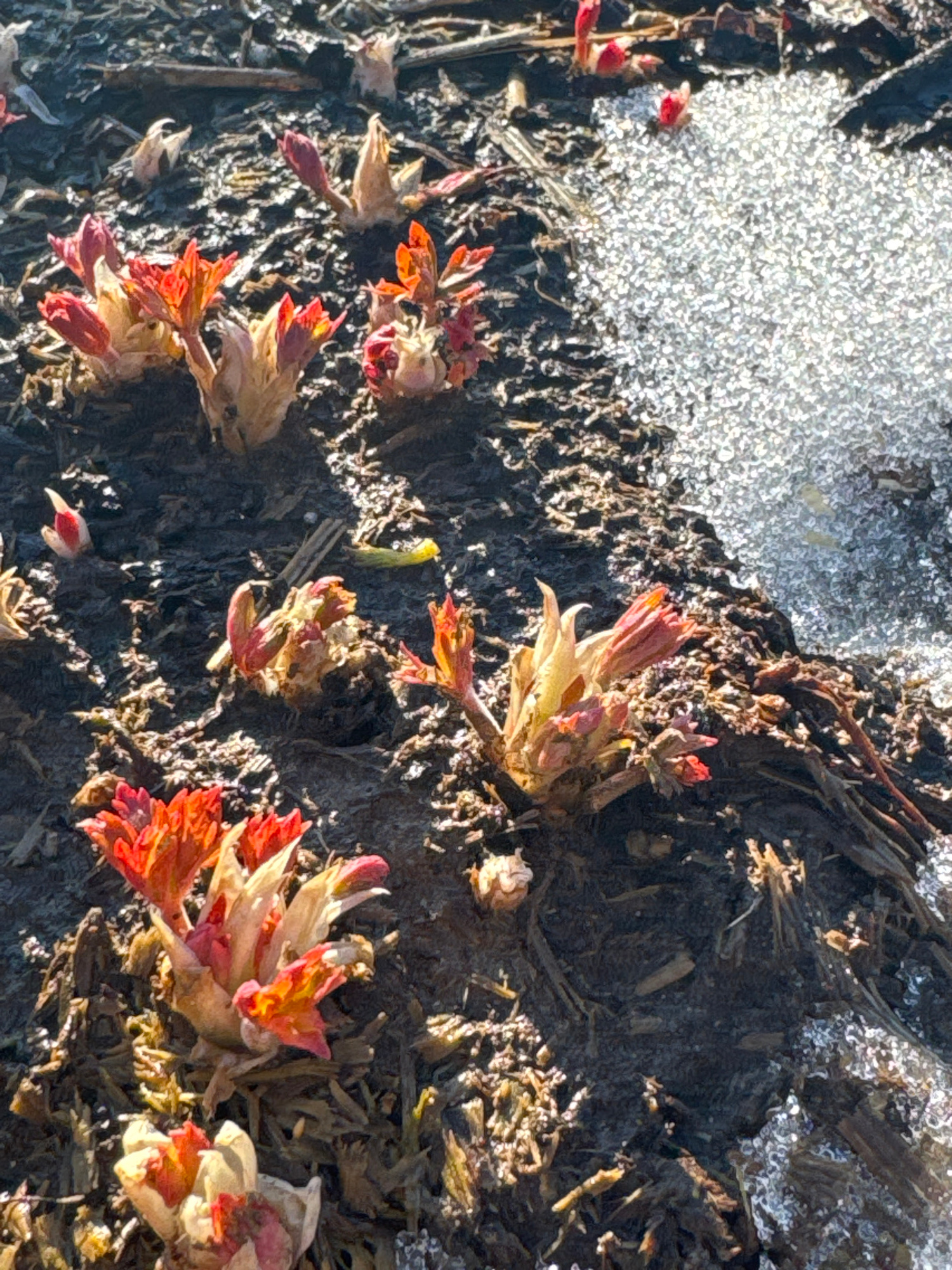 The scene depicts ground covered with dark soil mixed with remnants of dry vegetation and patches of melting snow or ice. Several small, budding plants are visible, featuring red or orange-tinged leav…read more