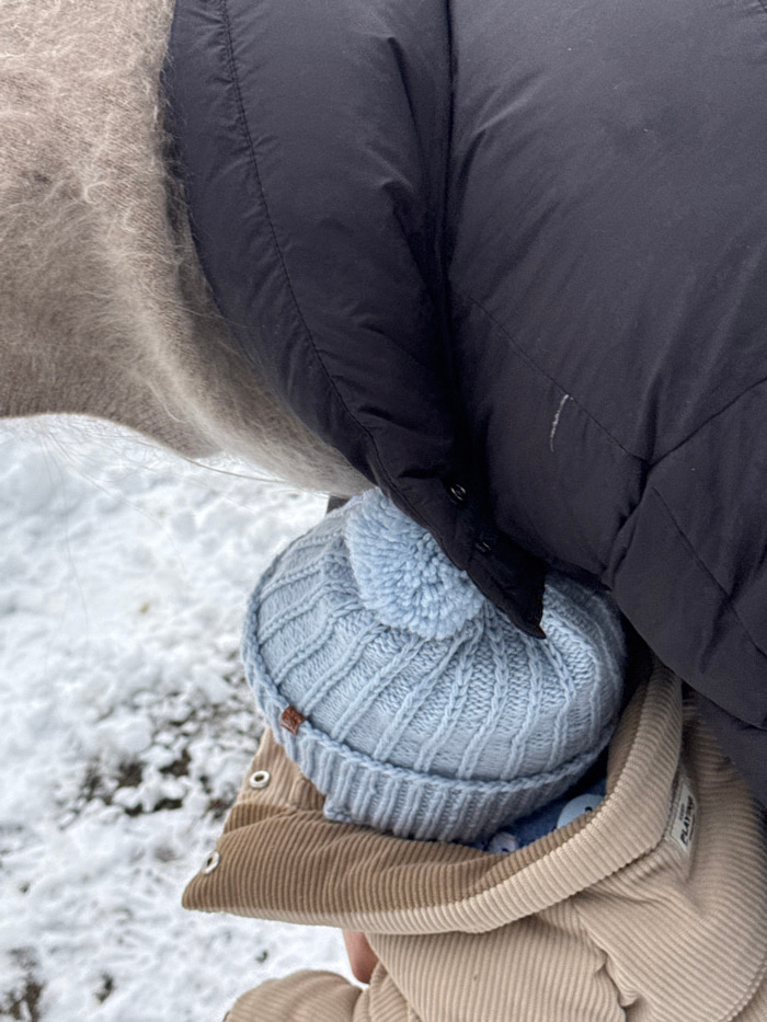 A wintery snapshot from above reveals a collection of textures and garments. A black puffer jacket presses against a light beige, fuzzy sweater. Nestled between them, a light blue knit hat with a pom-…read more