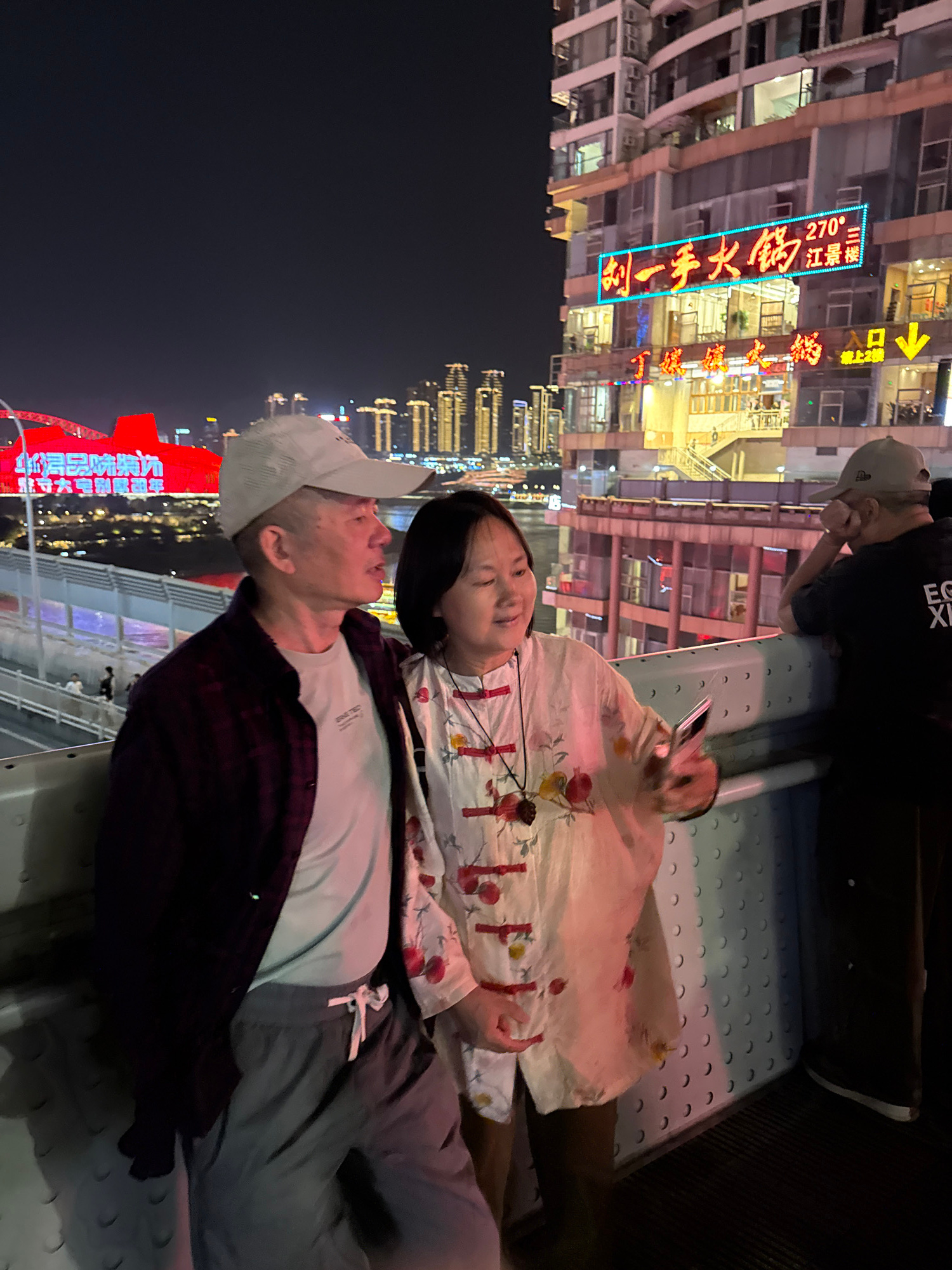 The image captures a vibrant nighttime scene in Yuzhong District, China, likely from an elevated viewpoint or walkway overlooking a cityscape. In the foreground, a man and a woman are the central subj…read more