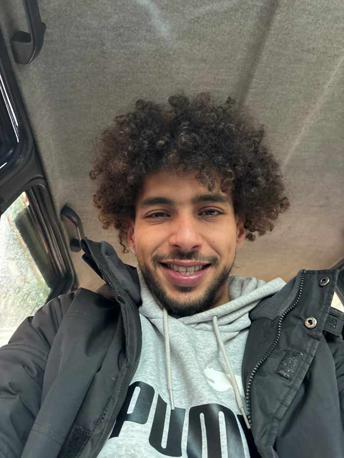 A smiling man with dark, curly hair and a beard is featured prominently in this image. He appears to be a young adult, looking directly at the camera with a wide, cheerful smile that reveals his upper…read more