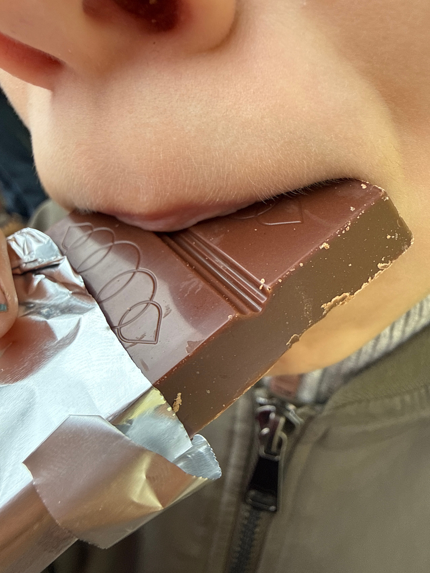 A close-up photograph shows a person's face pressed against a partially unwrapped chocolate bar. The chocolate bar is milk chocolate, still in its silver foil wrapper. The person's face is visible, in…read more