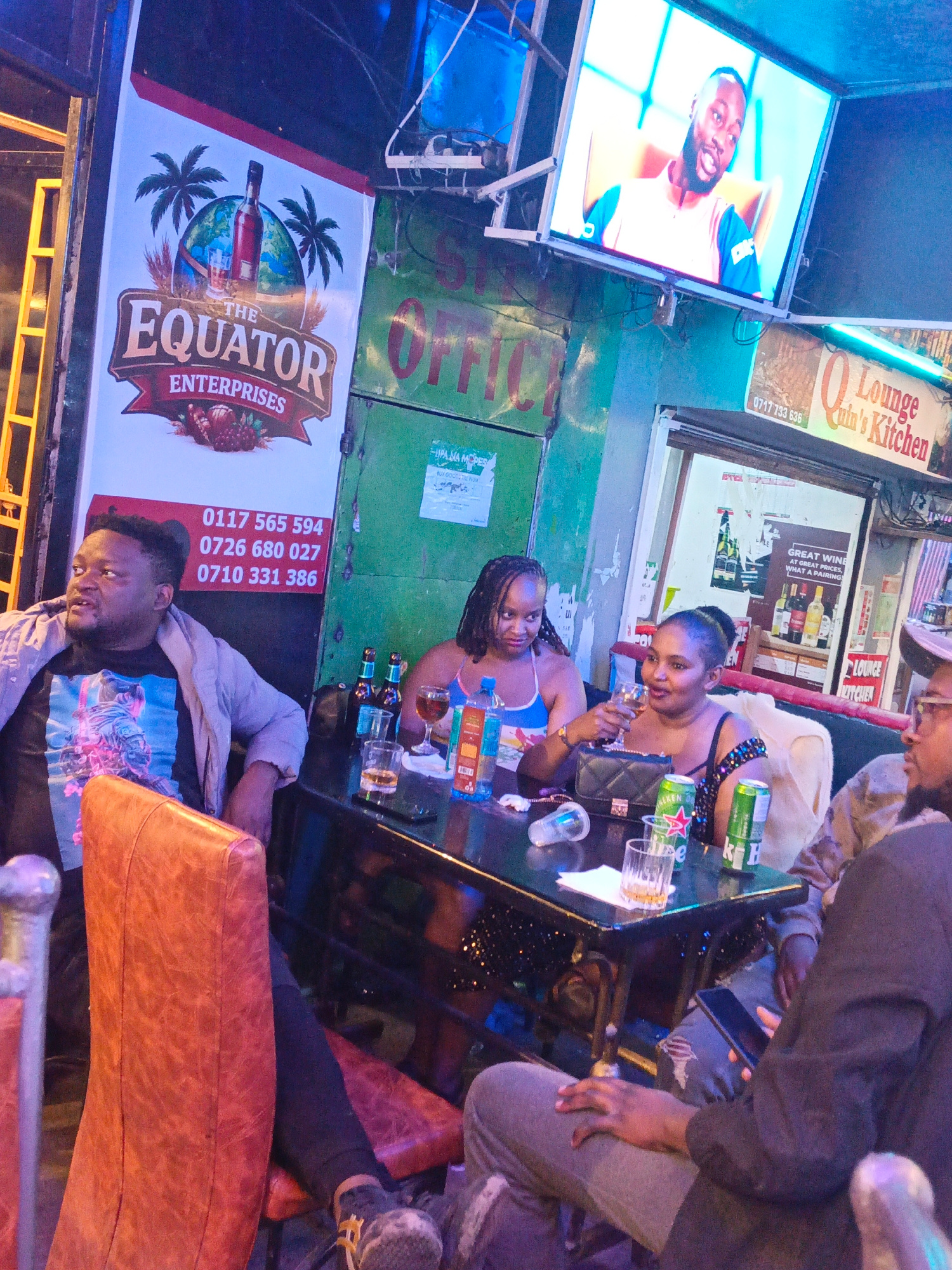 A group of four people are gathered around a black table in what appears to be a bar or lounge in Nairobi, Kenya. On the left side of the frame, a man with a dark t-shirt and a light-colored jacket is…read more