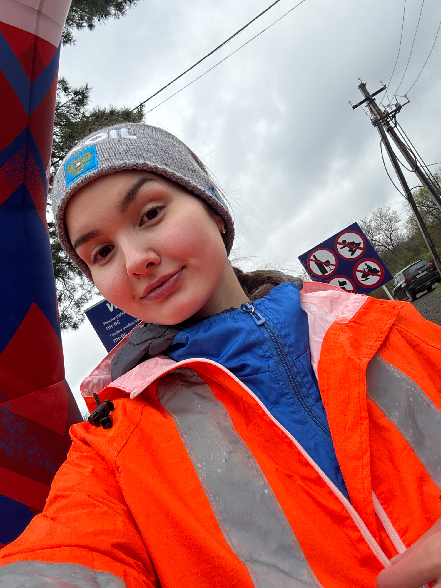 A person wearing a grey beanie with a blue emblem and an orange safety vest is posing for a selfie in front of a blue and red inflatable arch. Behind the person, there is a sign with several symbols iā¦read more