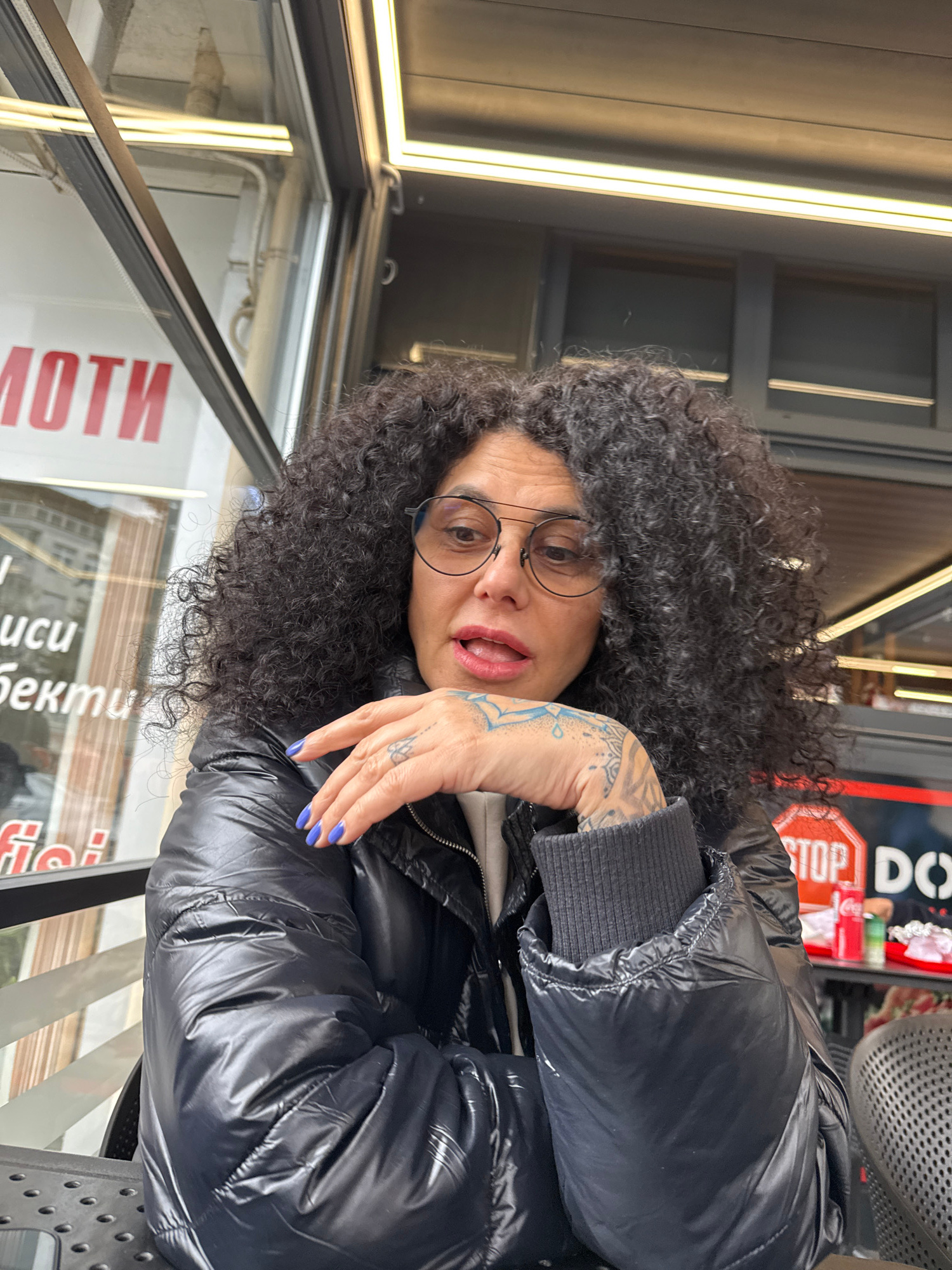 A medium shot captures a woman with dark, curly hair and glasses, wearing a shiny black puffer jacket with blue nail polish. She is positioned outdoors in front of a glass window with inscriptions in…read more