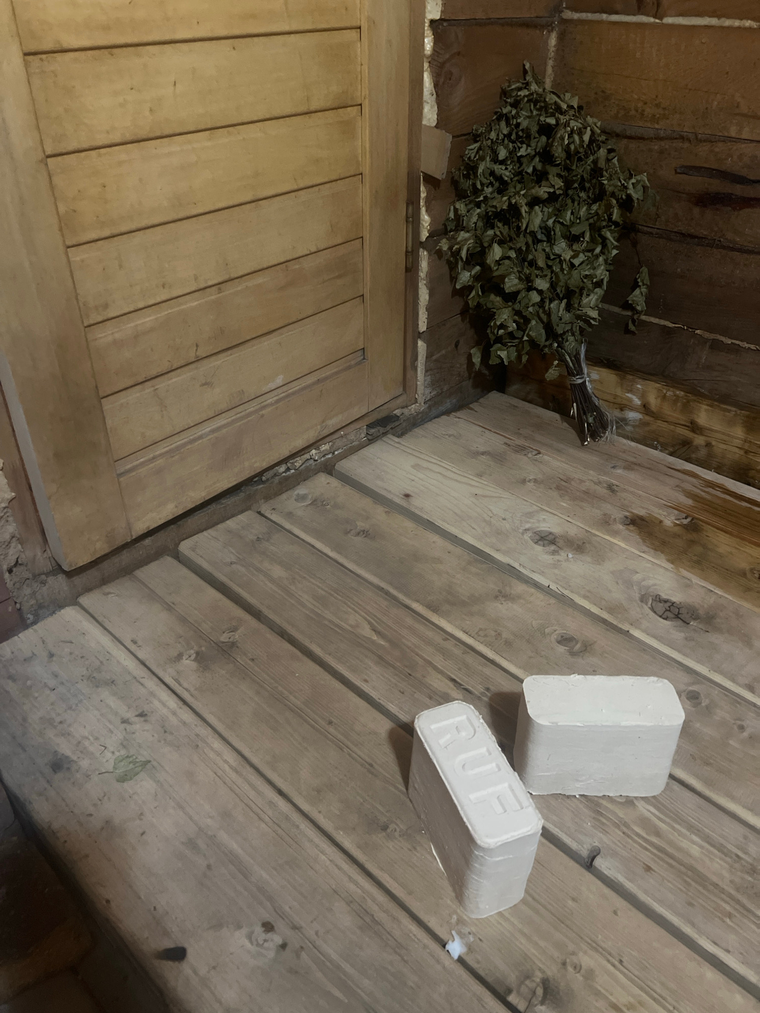 A medium-shot depicts the interior of a likely sauna, featuring wooden construction. In the upper-left corner rests a bundle of dried birch branches for traditional sauna use. Two white RUF wood briqu…read more