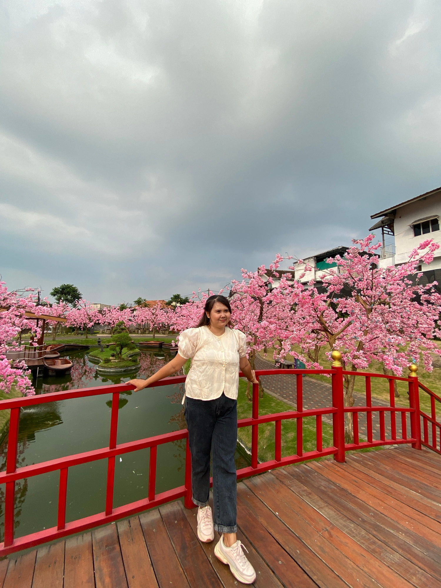 The image shows a woman standing on a wooden bridge with red railings, likely posing for a photograph. The bridge overlooks a pond or body of water, with artificial cherry blossom trees planted along…read more