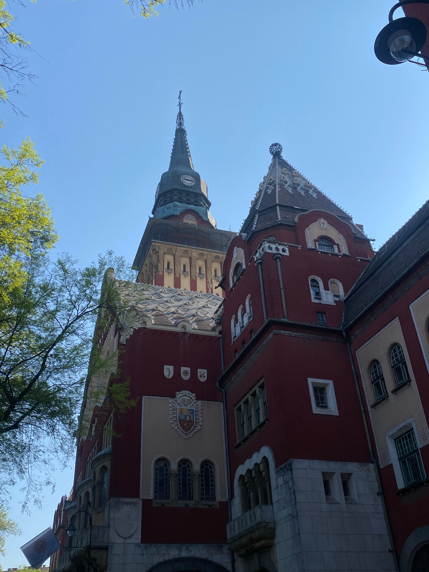 The image displays a grand, ornate building, likely the Subotica City Hall, viewed from a low angle against a clear blue sky. The architecture is characterized by its vibrant red walls, accented with…read more