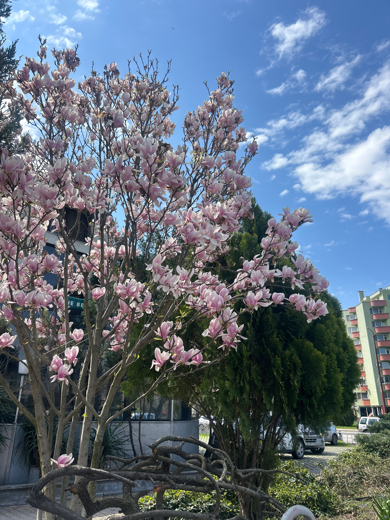 The image shows a flowering magnolia tree in Dimitrovgrad, Bulgaria, with pink and white blossoms filling the foreground and middle ground. The tree's bare branches are intertwined, supporting the num…read more