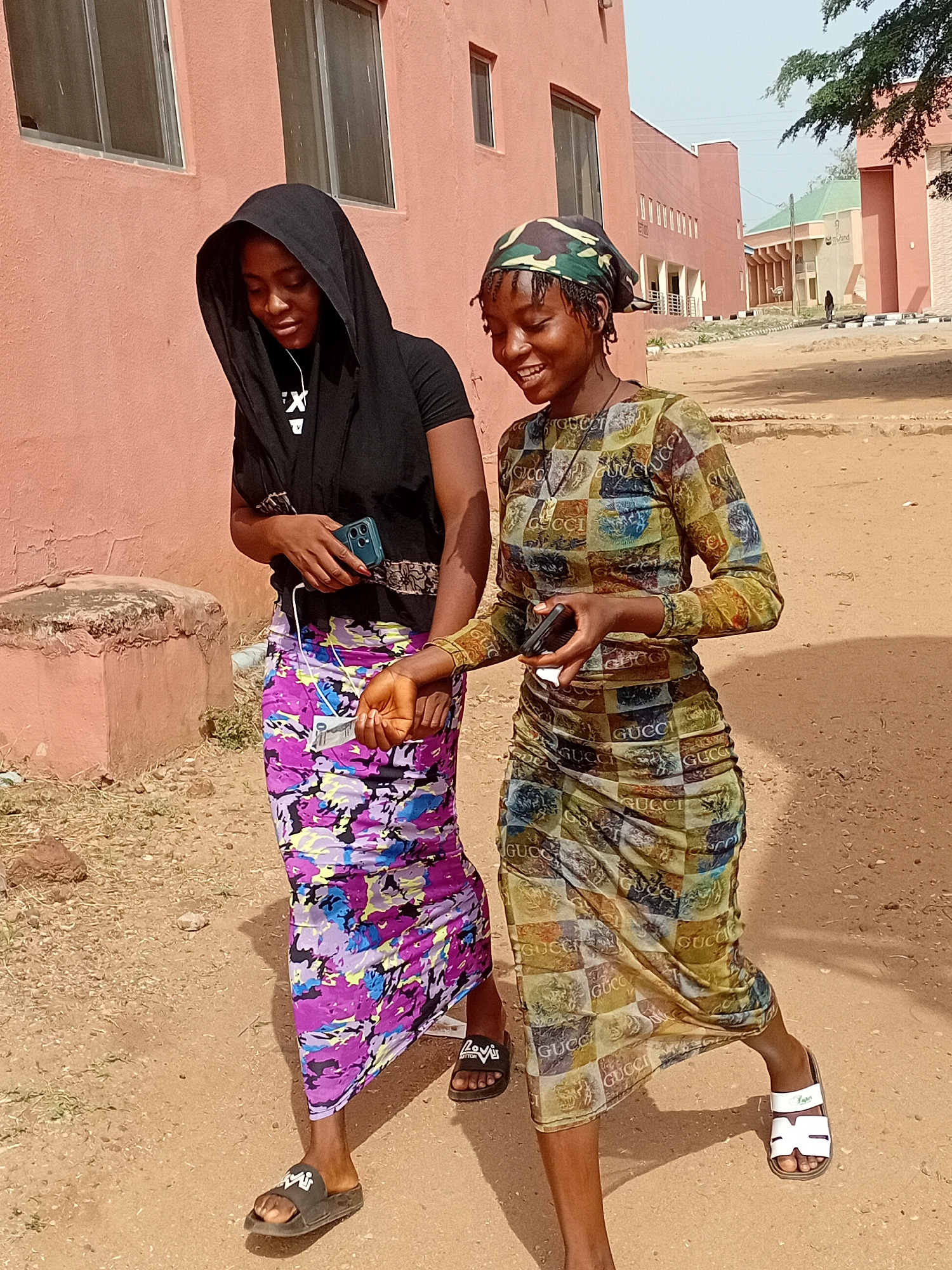 Two young African women are standing on what appears to be a dirt road or sidewalk in Lokoja, Nigeria. One woman is wearing a Gucci print dress, a patterned head covering, and white sandals. She is sm…read more