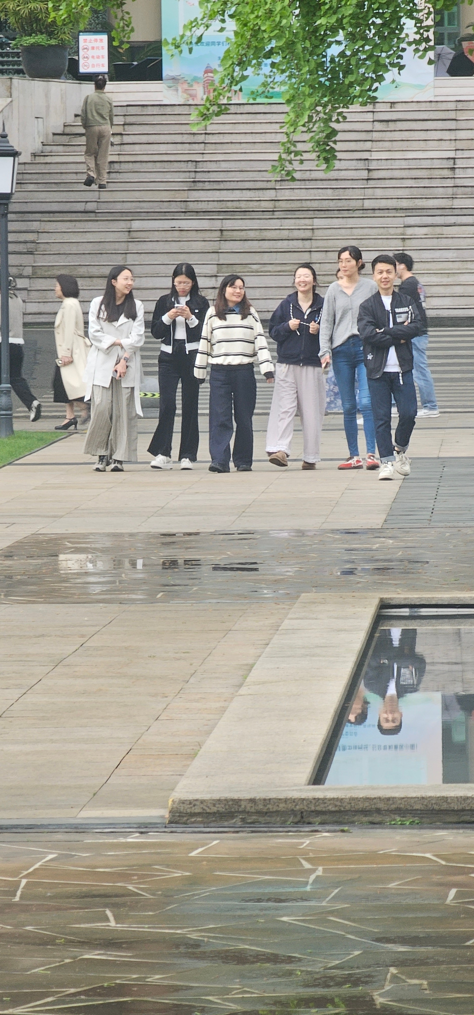 A group of eight people are standing on a staircase in an urban area. The people appear to be young adults, and they are arranged roughly in a line. They are wearing a variety of clothing styles. The…read more