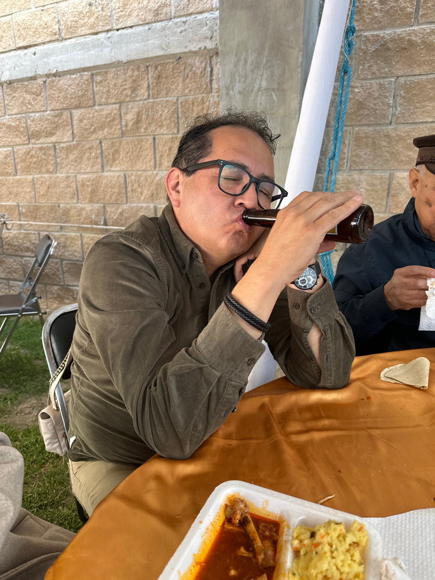 A man with short dark hair and glasses is drinking directly from a brown glass bottle. He is wearing a khaki-colored button-down shirt, light-colored pants, a wristwatch, and a black bracelet. A parti…read more